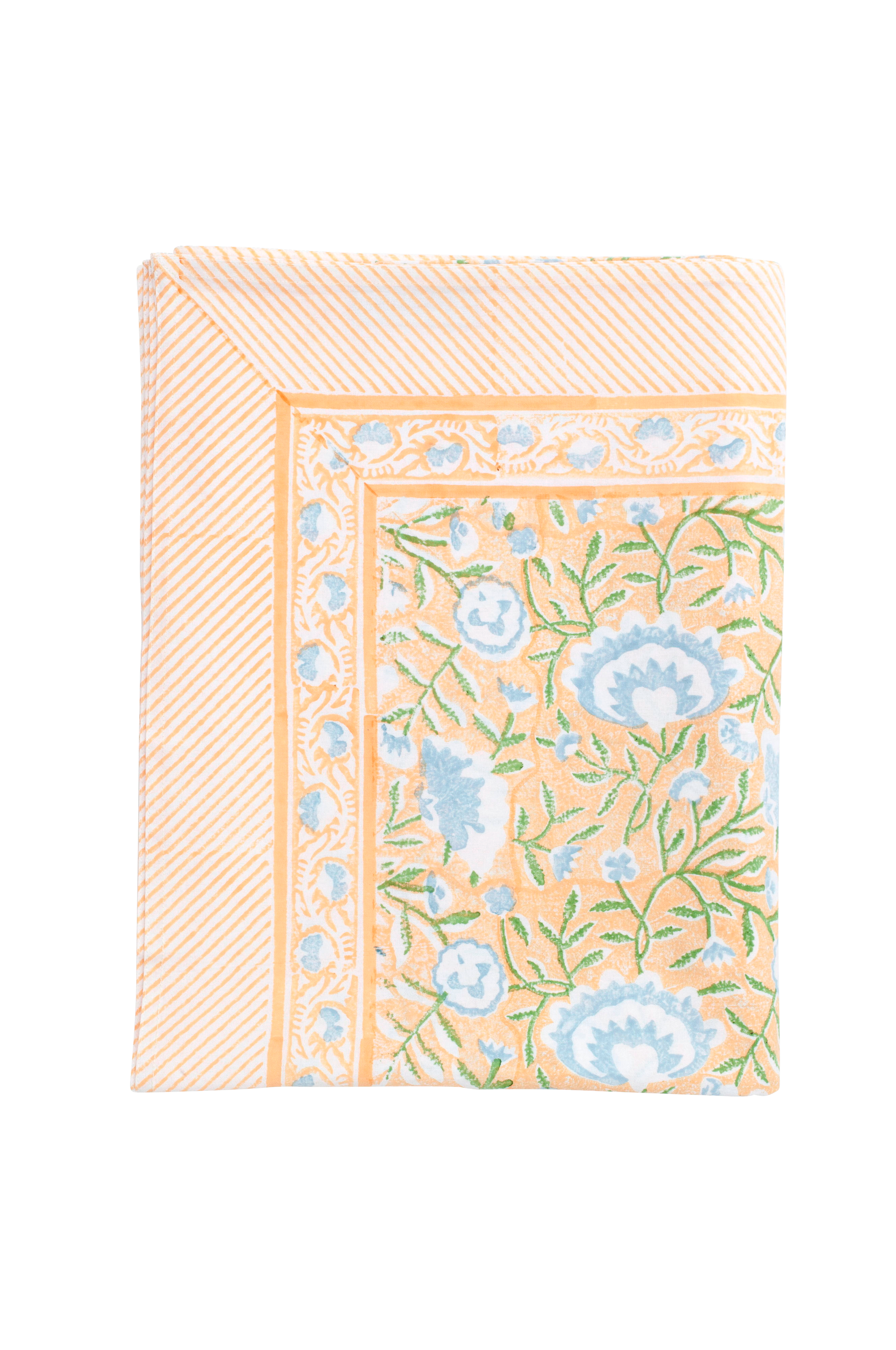 En vacker bordsduk med dekorativt blommönster och ornamental kant. Varje duk är omsorgsfullt handtryckt med hjälp av den urgamla träsnittstekniken, en beprövad teknik som ger djup, textur och själ till varje textil.