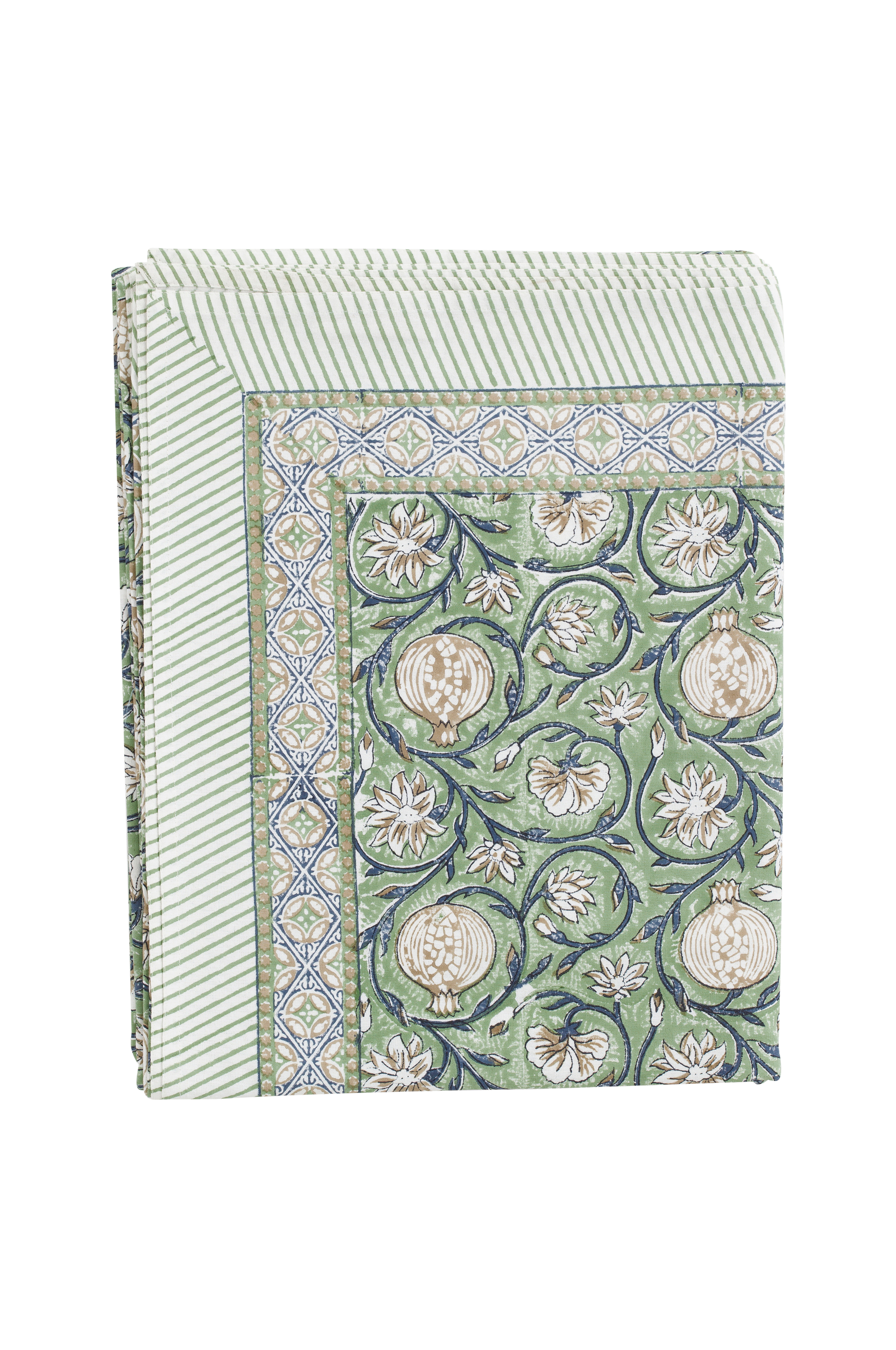 Dekorativ bordsduk i bomull av hög kvalitet med ett vackert mönster av virvlande stjälkar, blad och granatäpplen. Mönstret är tryckt för hand med traditionell indisk blocktrycksteknik. Ett traditionellt hantverk som ger varje kuddfodral ett unikt och dekorativt uttryck. Detta kuddfodral levereras utan innerkudde. Tvätta med omsorg på ett kort (max 1 timme) och skonsamt program för ull/silke med milt tvättmedel.