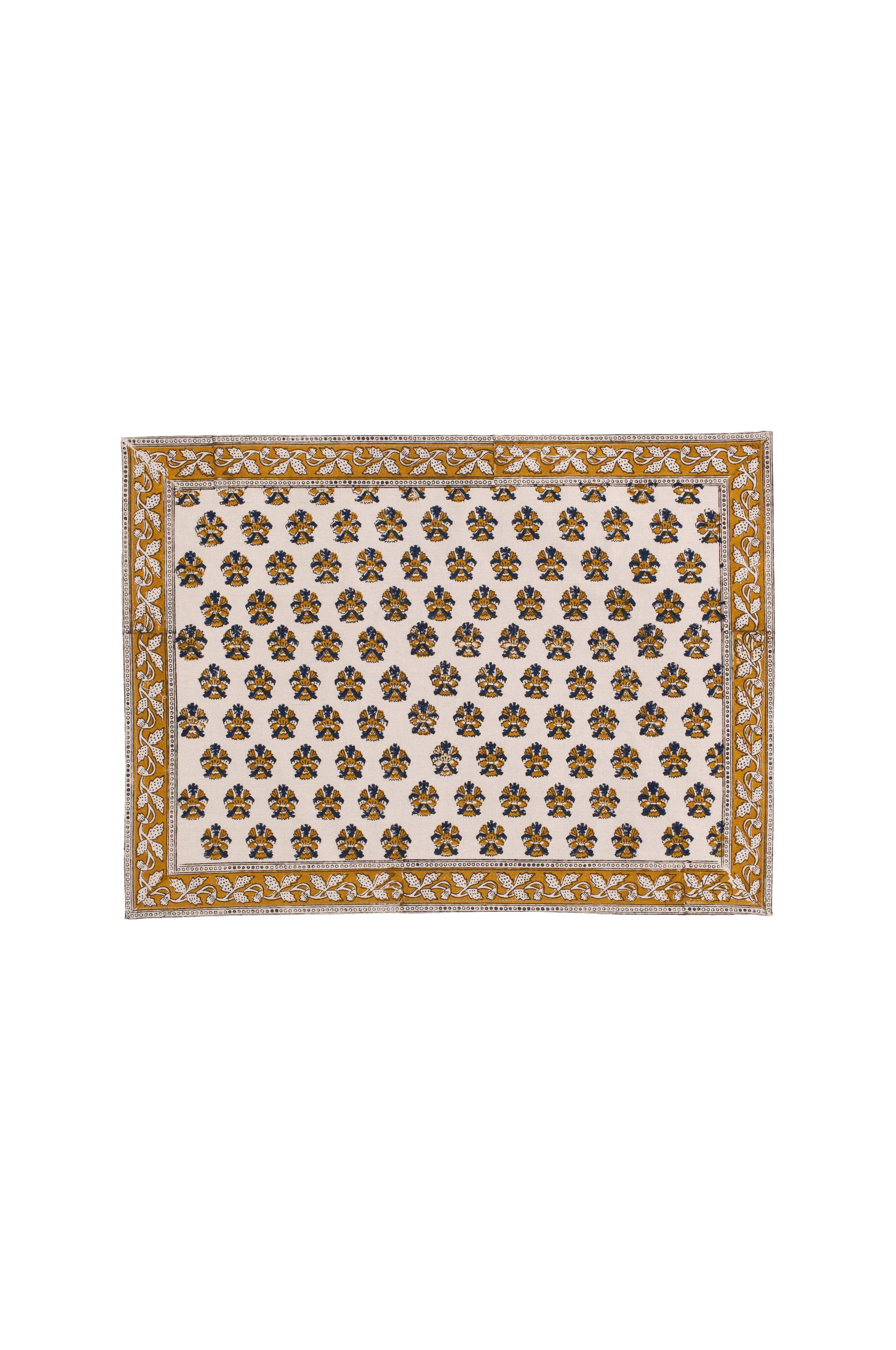Set med två dekorativa bordstabletter med ett elegant upprepat mönster och dekorativ kant längs kanten. Varje bordstablett är noggrant handtryckt med hjälp av den urgamla träsnittskonsten, en beprövad teknik som ger djup, textur och själ till varje textil. Tvätta dina handtryckta servetter på ett kort (max 1 timme) och skonsamt program för ull/silke med milt tvättmedel. Stryk som bomull.