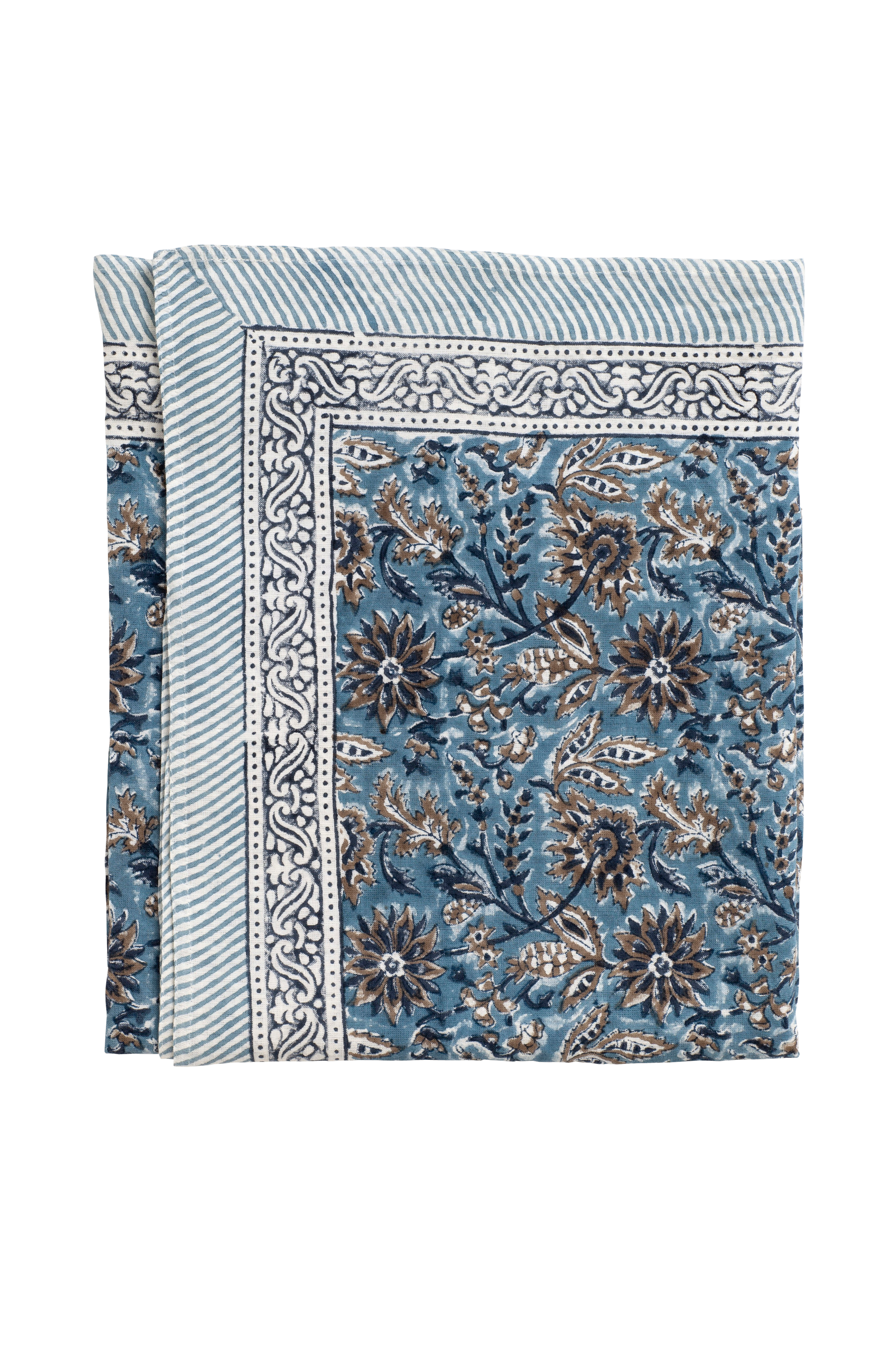 Linneduk med vackert handtryckt mönster i traditionell indisk blockprintteknik. Ett unikt hantverk som ger duken ett harmoniskt, levande och dekorativt uttryck.
