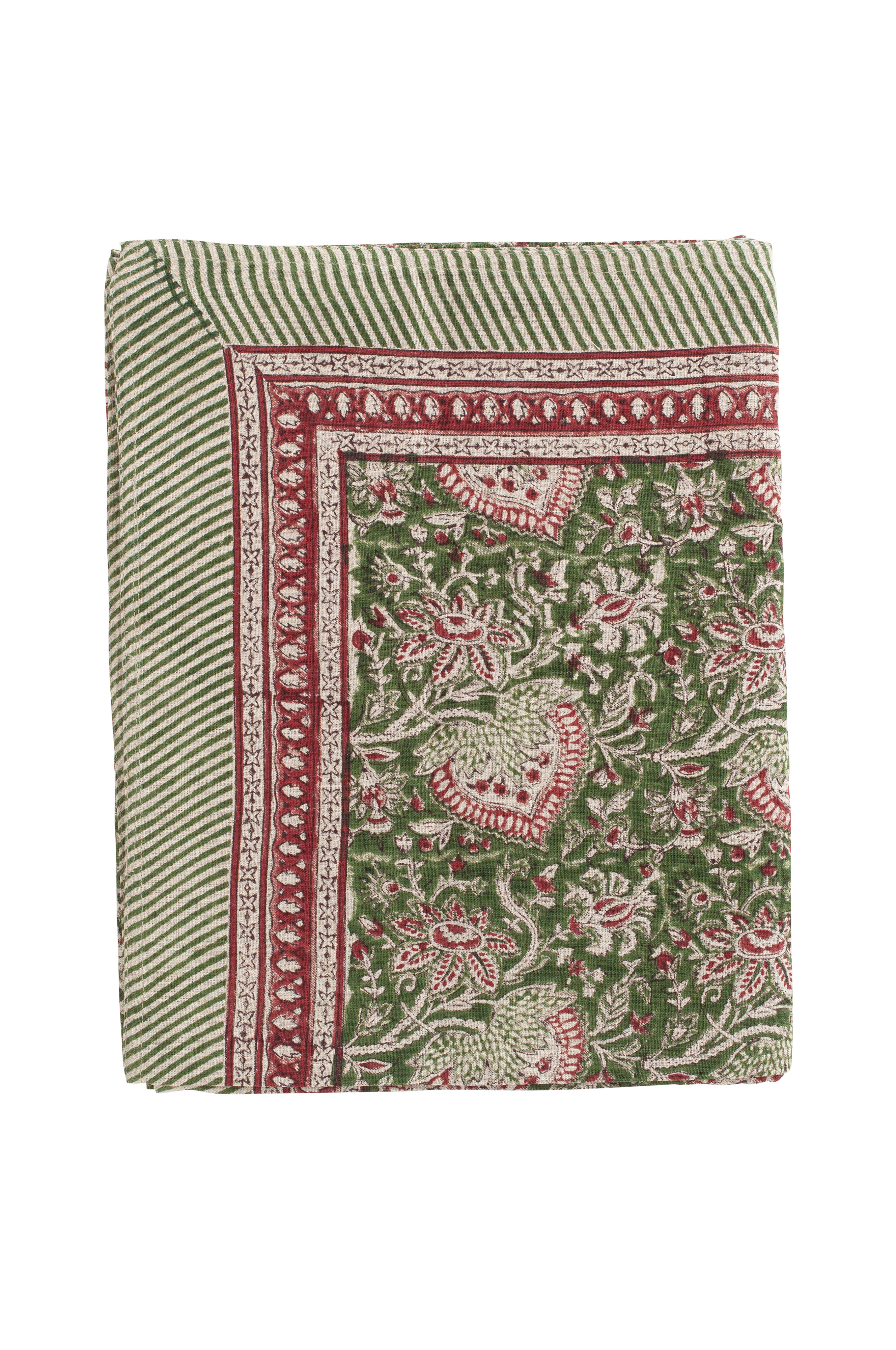 Exklusiv linneduk med elegant mönster i flera färger. Mönstret är tryckt för hand med traditionell indisk blockprintteknik. Ett unikt hantverk som ger duken ett levande och dekorativt uttryck.