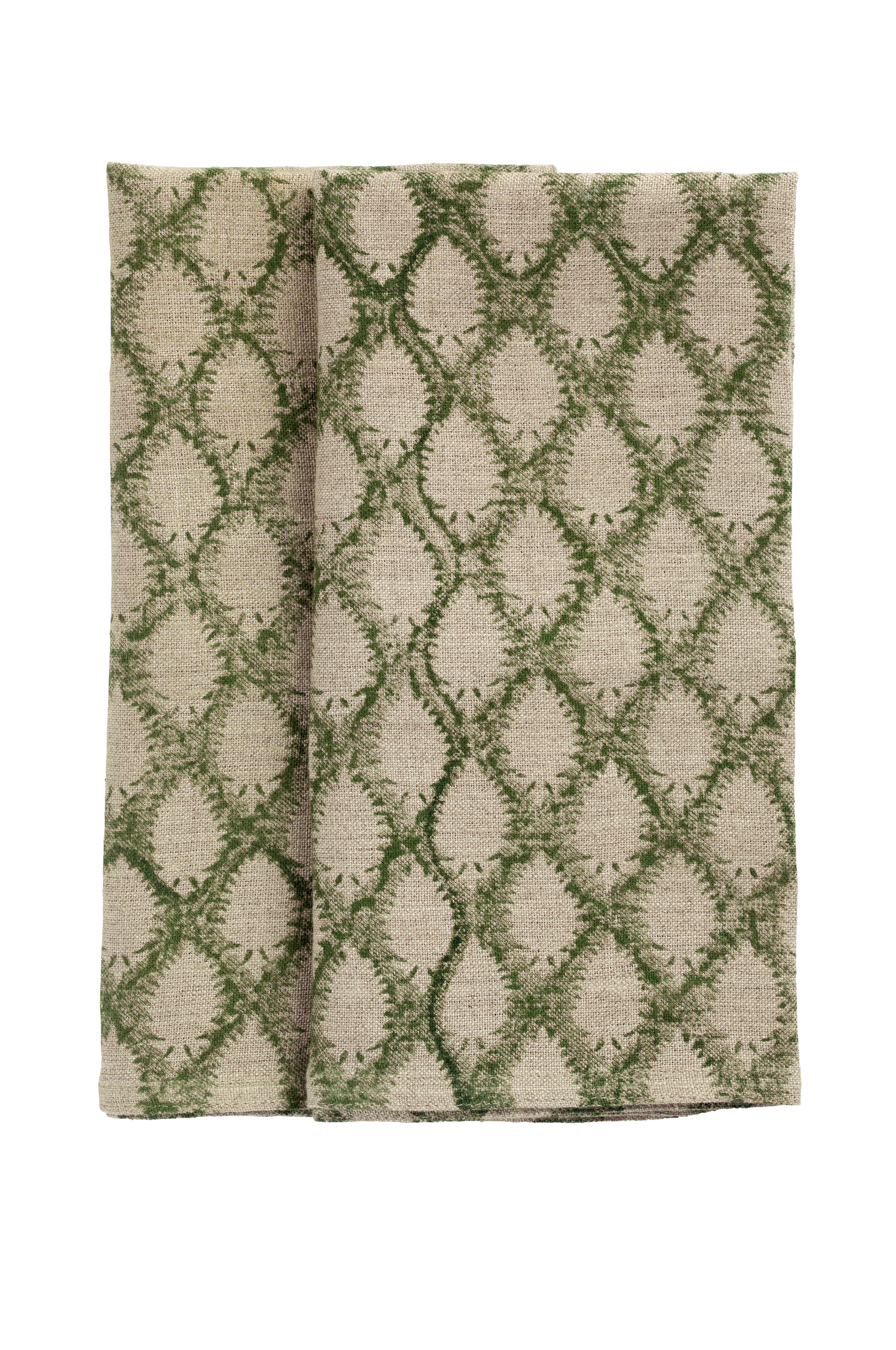 Två mönstrade linneservetter. Mönstret är tryckt för hand i traditionell indisk blockprintteknik. Den handgjorda tekniken gör varje servett unik och ger et ett levande och dekorativt uttryck.