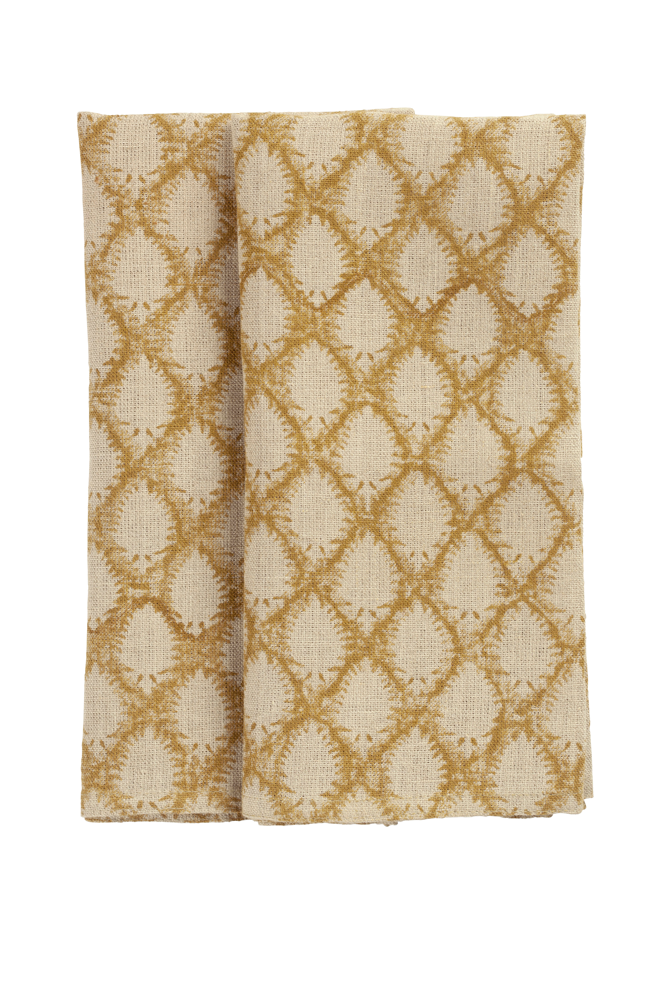 Två mönstrade linneservetter. Mönstret är tryckt för hand i traditionell indisk blockprintteknik. Den handgjorda tekniken gör varje servett unik och ger et ett levande och dekorativt uttryck.