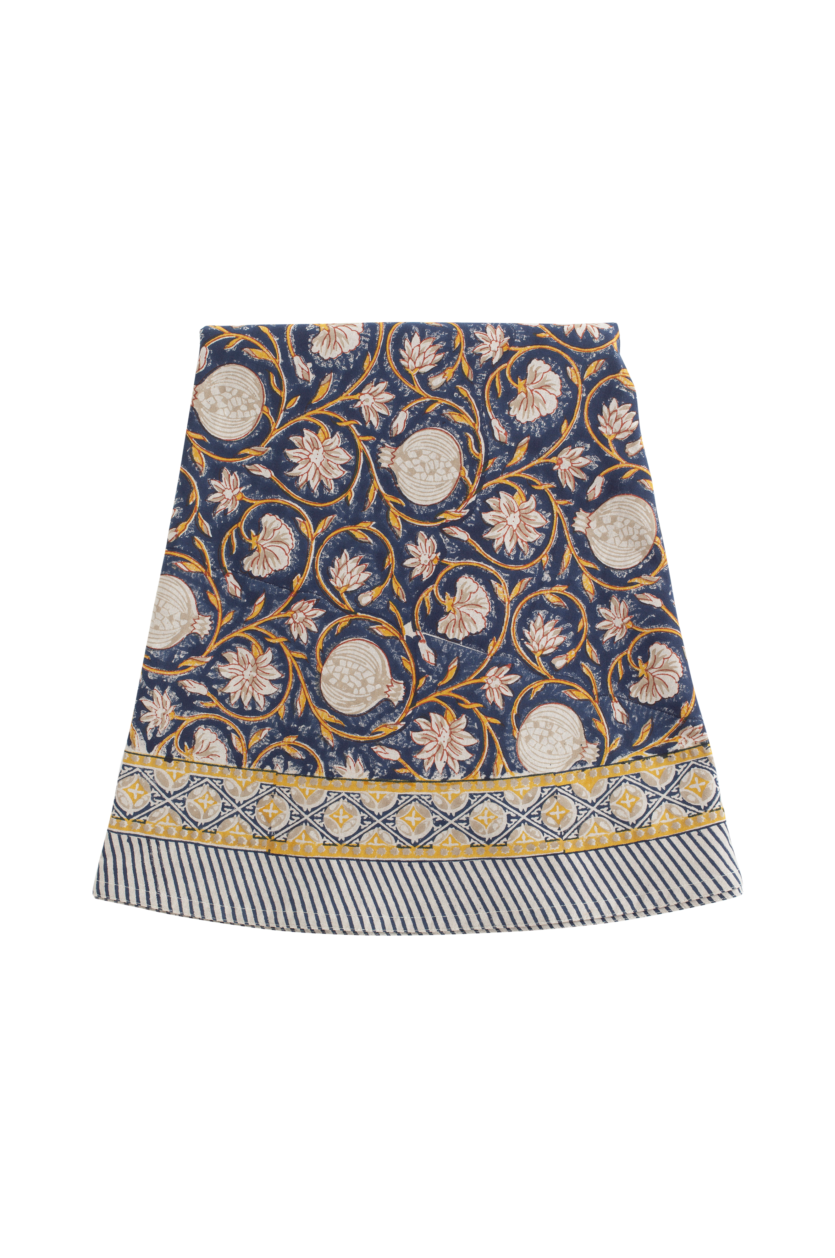 En vacker bordsduk i högkvalitativ bomull med ett pomegranate -mönster och en dekorativ kant. Mönstret är tryckt för hand med hjälp av traditionella indiska blocktryckstekniker. Ett unikt hantverk som ger varje duk ett unikt och dekorativt uttryck. Tvätta din duk på ett kort (max 1 timme) och skonsamt program för ull/silke med milt tvättmedel.