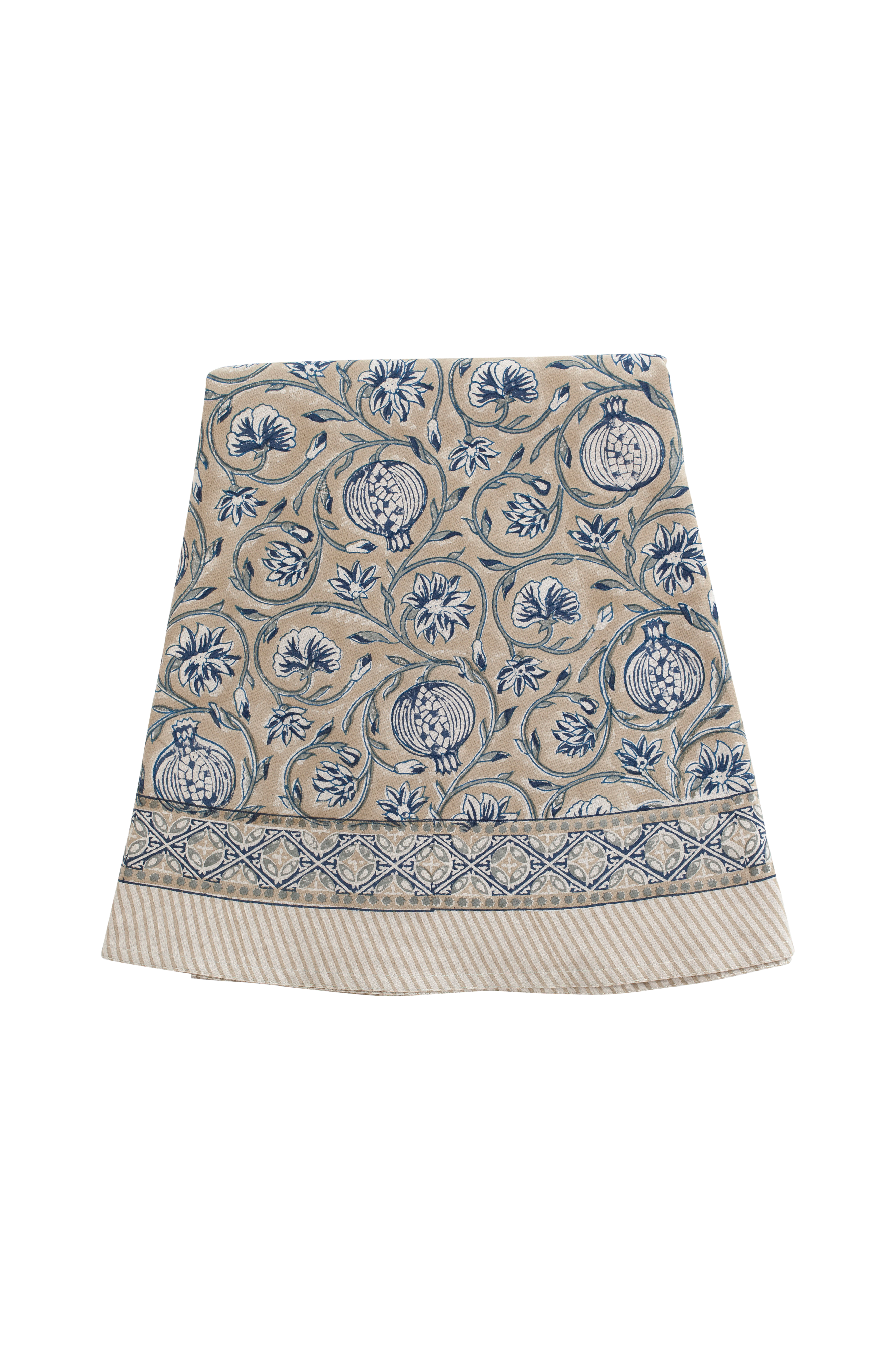 En vacker bordsduk i högkvalitativ bomull med ett pomegranate -mönster och en dekorativ kant. Mönstret är tryckt för hand med hjälp av traditionella indiska blocktryckstekniker. Ett unikt hantverk som ger varje duk ett unikt och dekorativt uttryck. Tvätta din duk på ett kort (max 1 timme) och skonsamt program för ull/silke med milt tvättmedel.