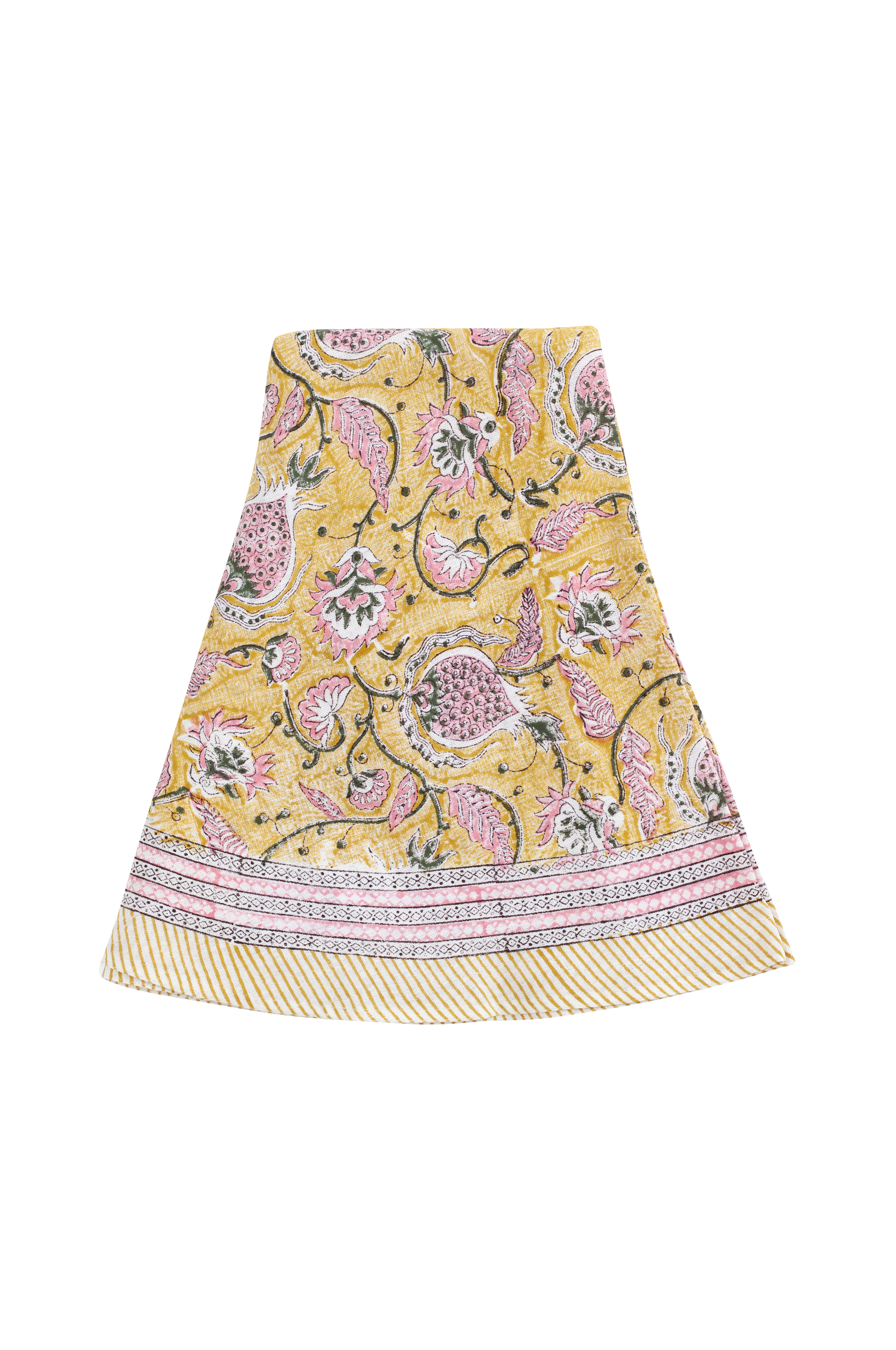 Lyxig rund linneduk med exotiskt mönster och dekorativ board. Mönstret är tryckt för hand i traditionell indisk blockprintteknik. Ett unikt hantverk som ger duken ett levande och dekorativt uttryck.