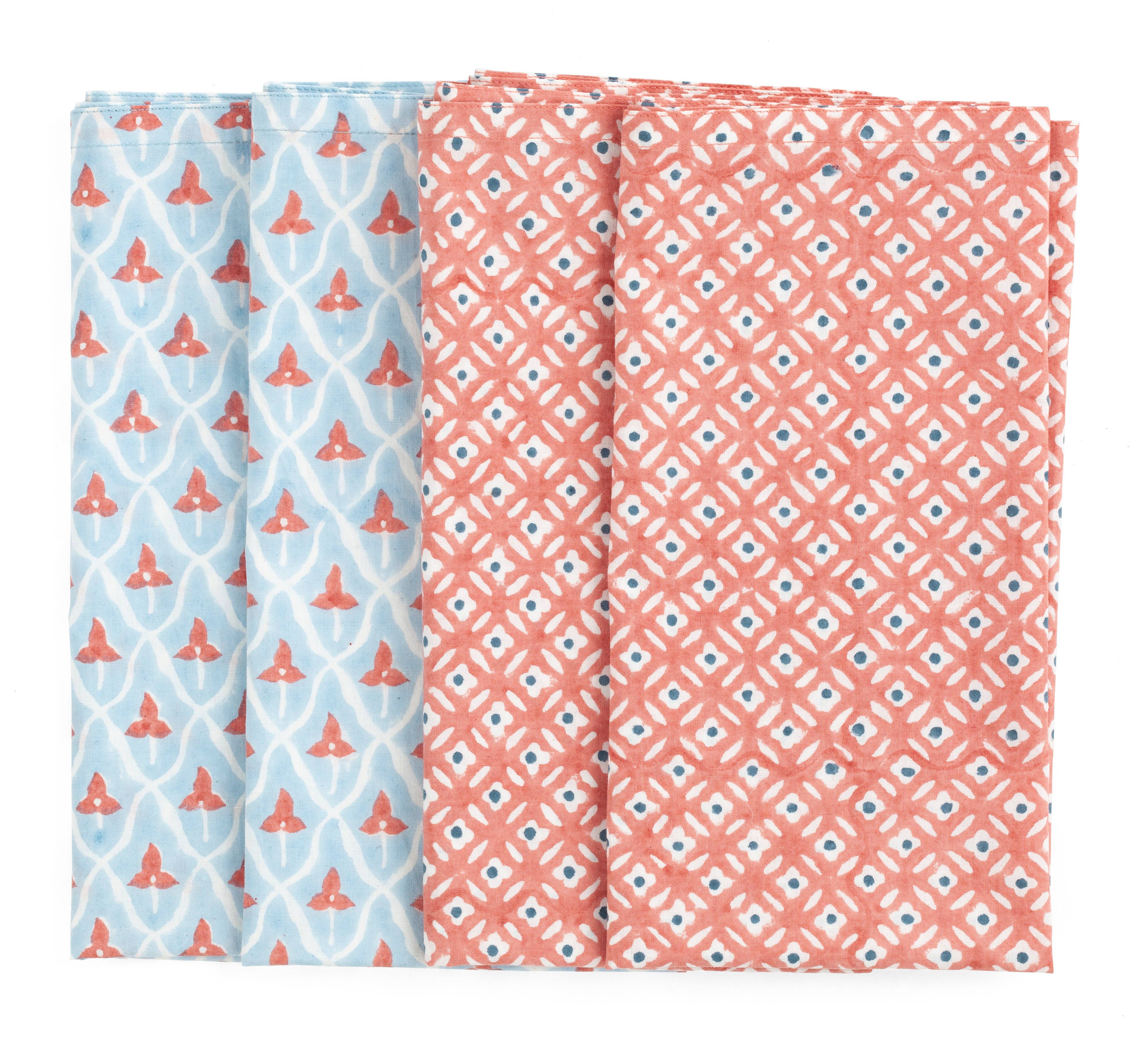 Set med fyra dekorativa servetter, tillverkade av Gots certifierad ekologisk bomull. Servetterna har två tryck som passar bra ihop. Varje servett är noggrant handtryckt med hjälp av den urgamla träsnittskonsten, en beprövad teknik som ger djup, textur och själ till varje textil. Tvätta dina handtryckta servetter på ett kort (max 1 timme) och skonsamt program för ull/silke med milt tvättmedel. Stryk som bomull.