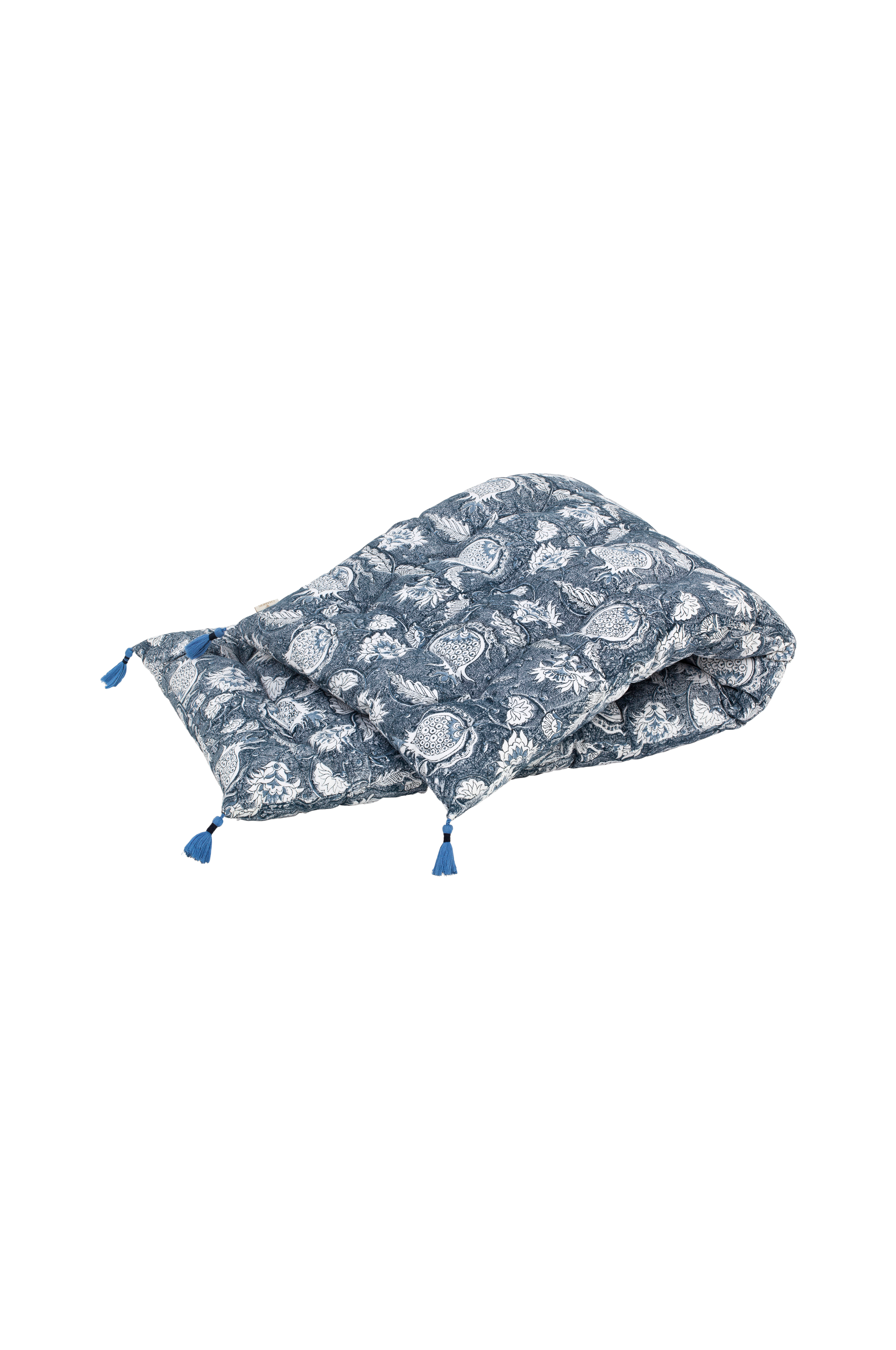 Sittdyna med vackert mönster och dekorativa tofsar. Kommer i flera storlekar. Mönstret är tryckt för hand i klassisk blockprint teknik.