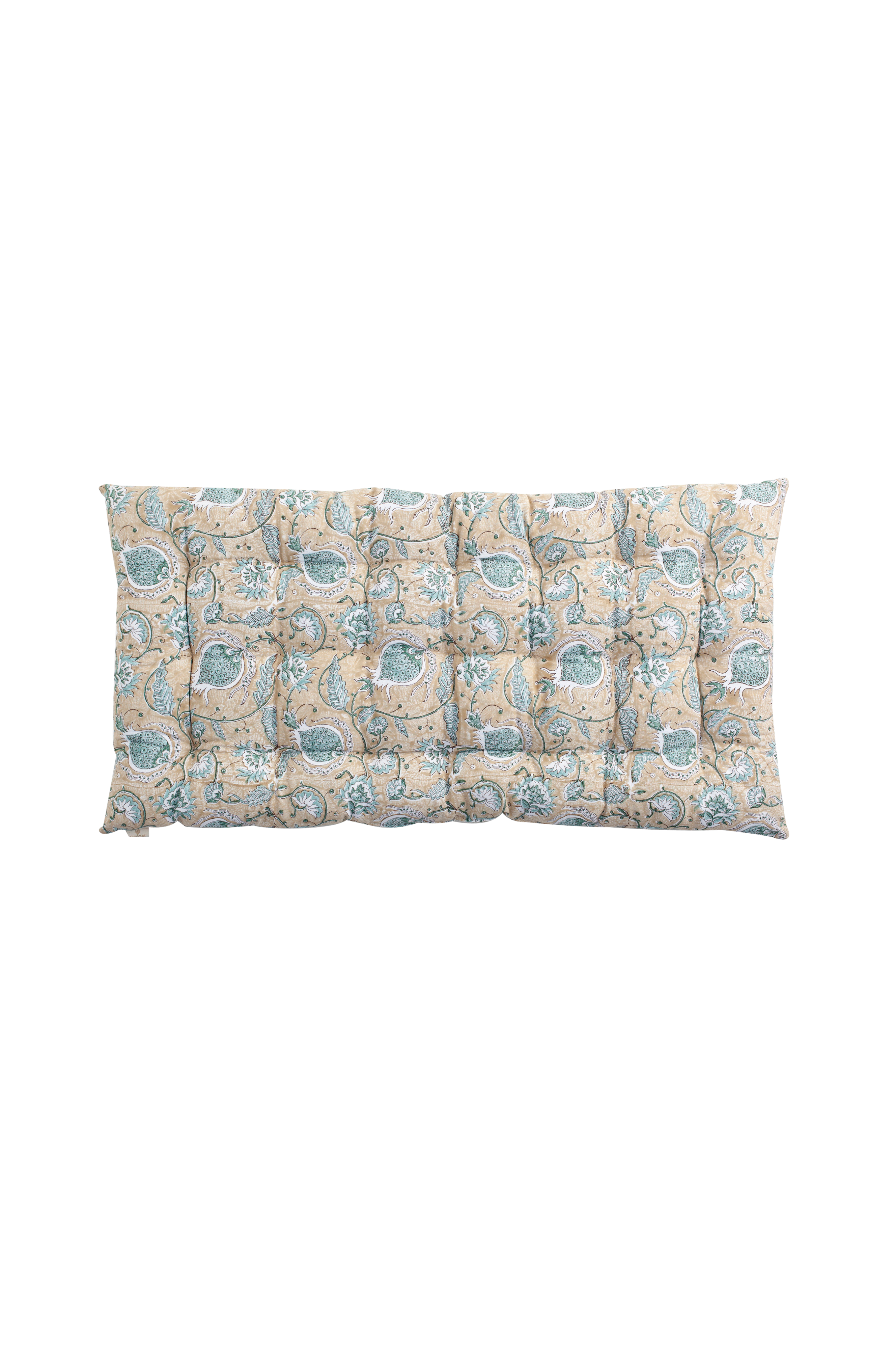 Mönstrad sittdyna med dekorativa tofsar från varumärket Chamois. Mönstret är tryckt för hand i traditionell indisk blockprintteknik. Ett unikt hantverk som ger duken ett levande och dekorativt uttryck.
