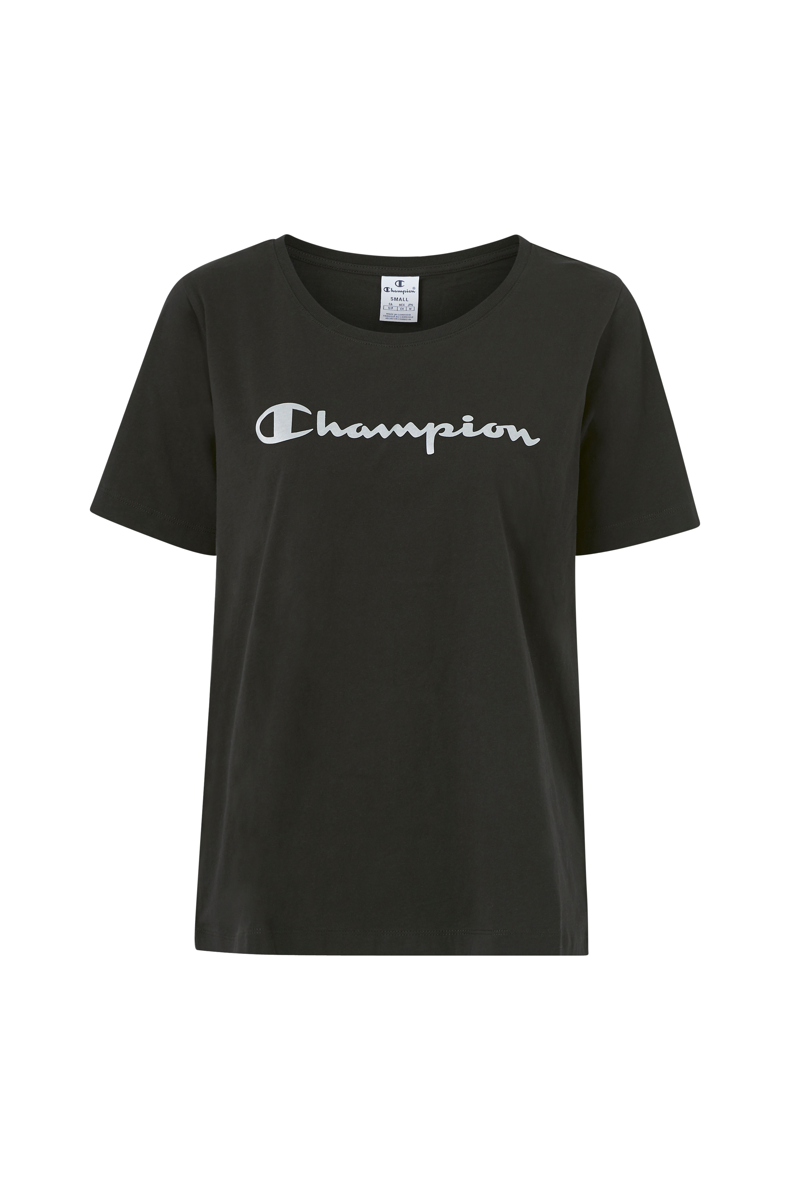 Kortärmad topp i mjuk bomullstrikå med metallictryckt Champion-logga fram. Rund, ribbad halsringning.