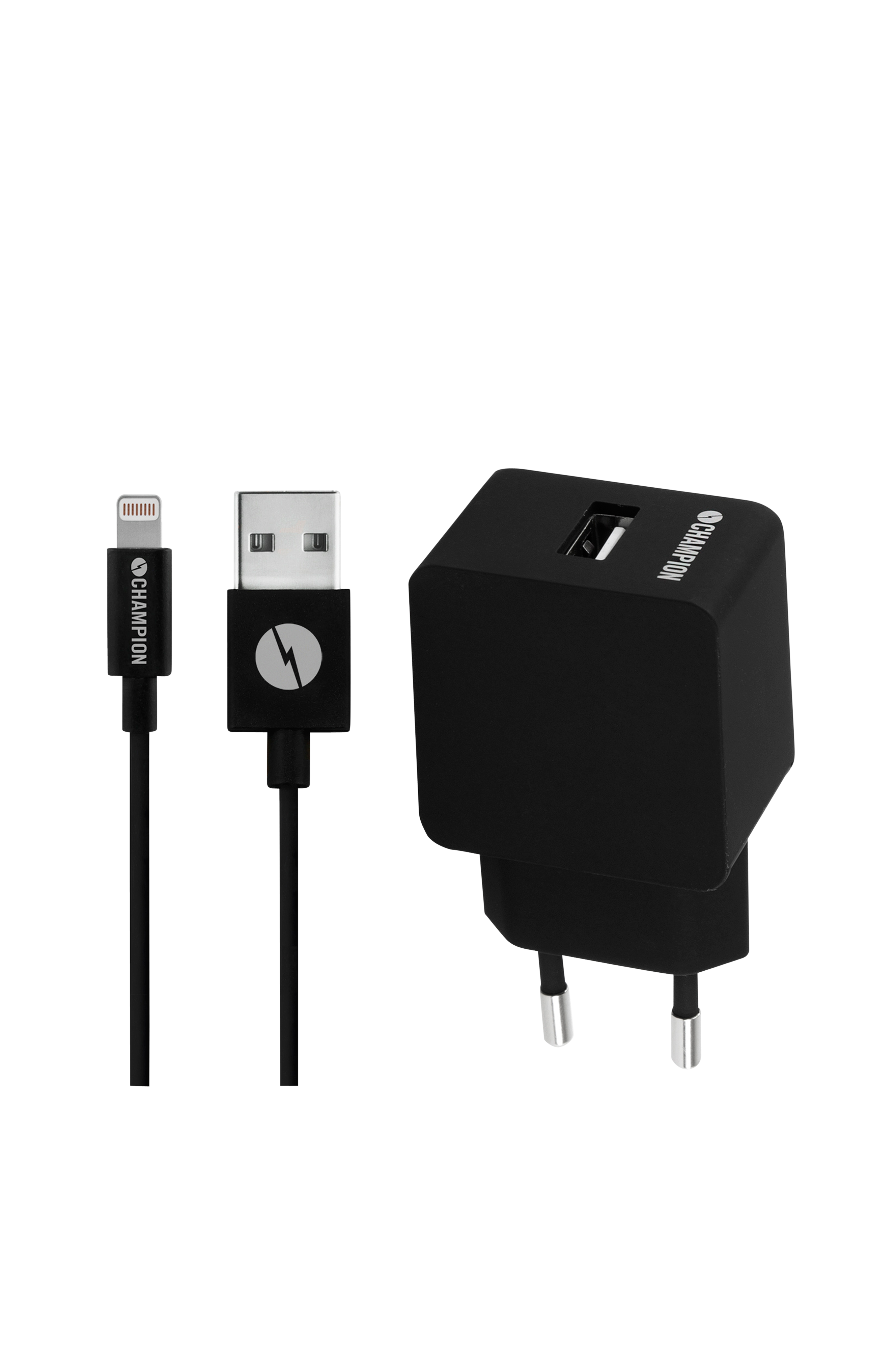 Kit för att ladda och synkronisera Apple produkter. Lightning-kabeln kan även användas för att synkronisera med en dator. USB laddare för 230 Volts uttag.