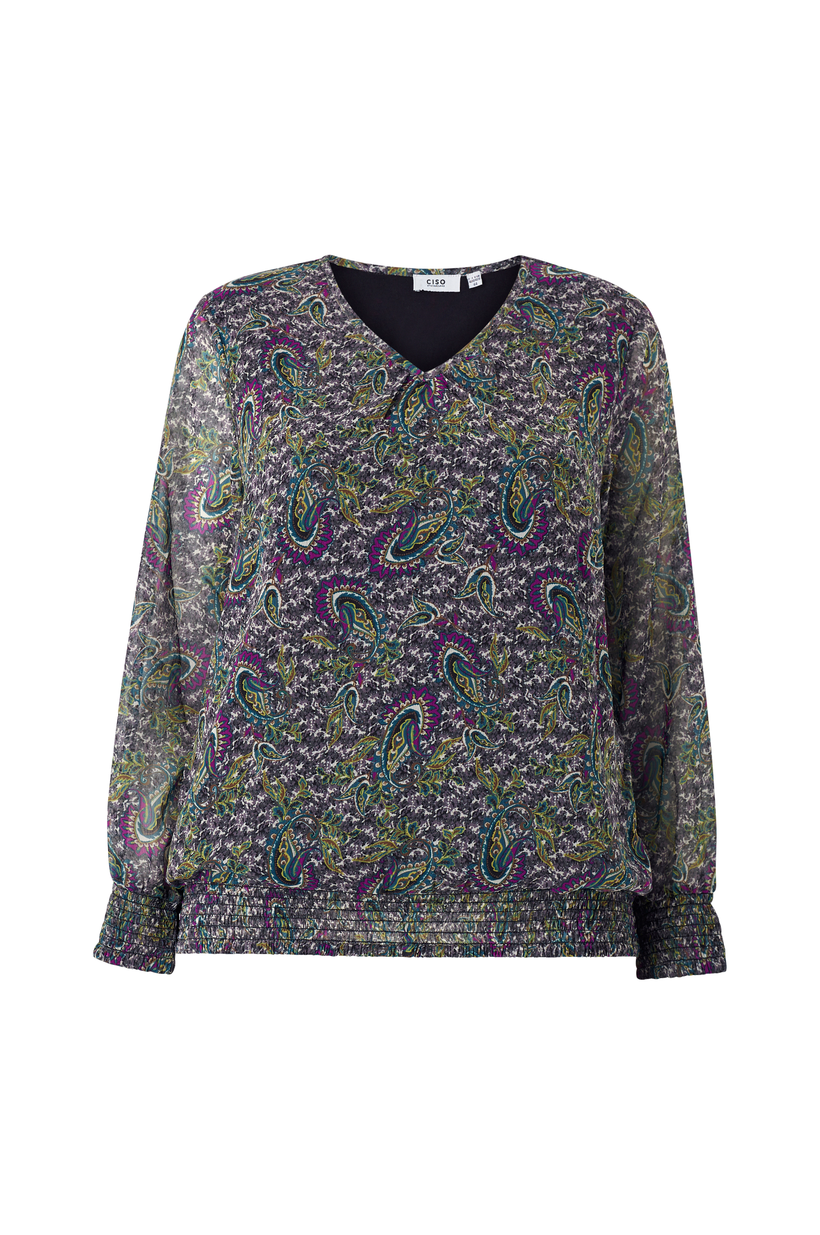 • V-ringning• Elastisk smock nedtill och i ärmsluten• Transparenta ärmar• Gjord av chiffong• Trikåfoder• Plusstorlekar
