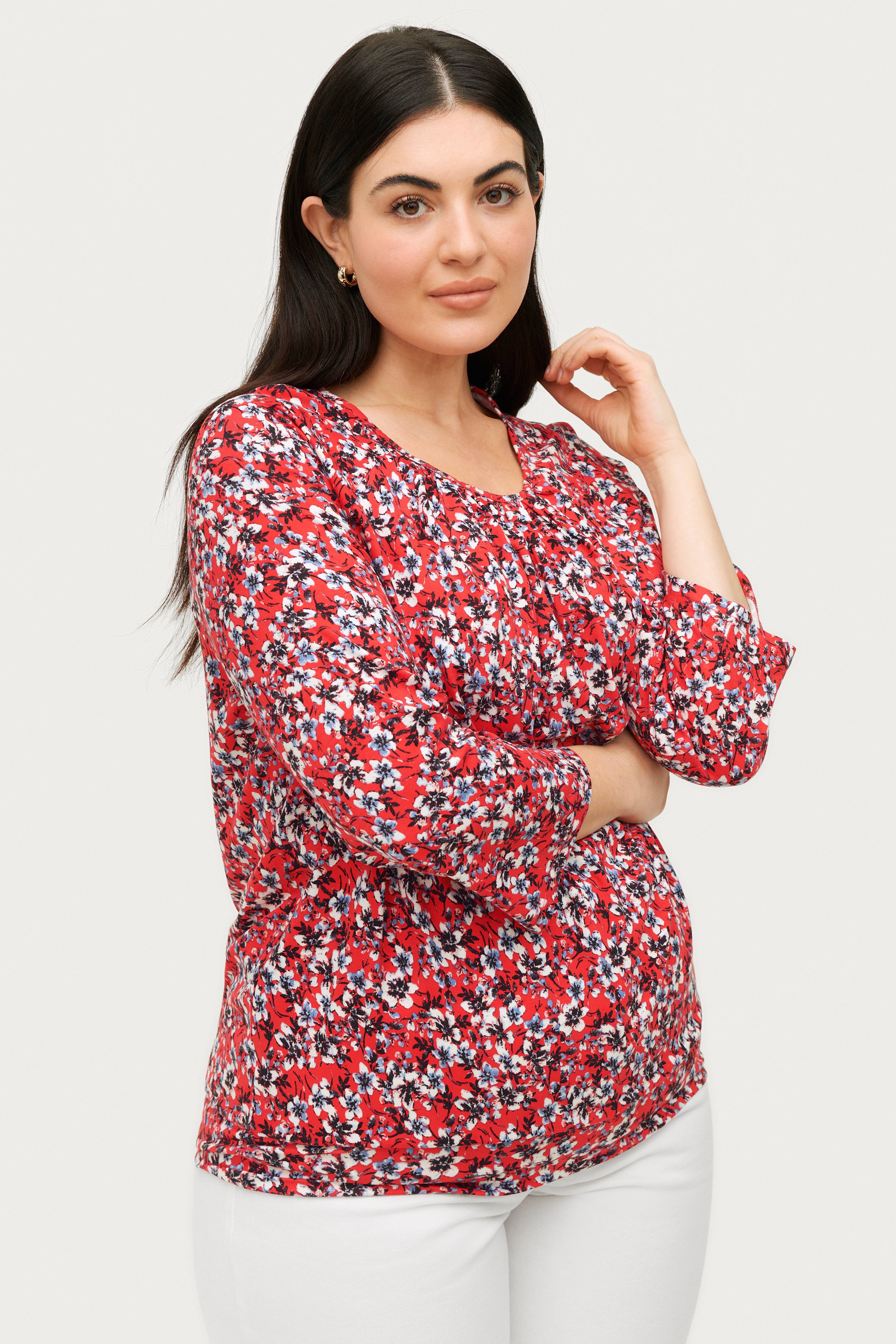 • Rak modell i trikå• Rund hals med rynk fram• Utsvängd, 3/4-lång raglanärm• Kant nedtill