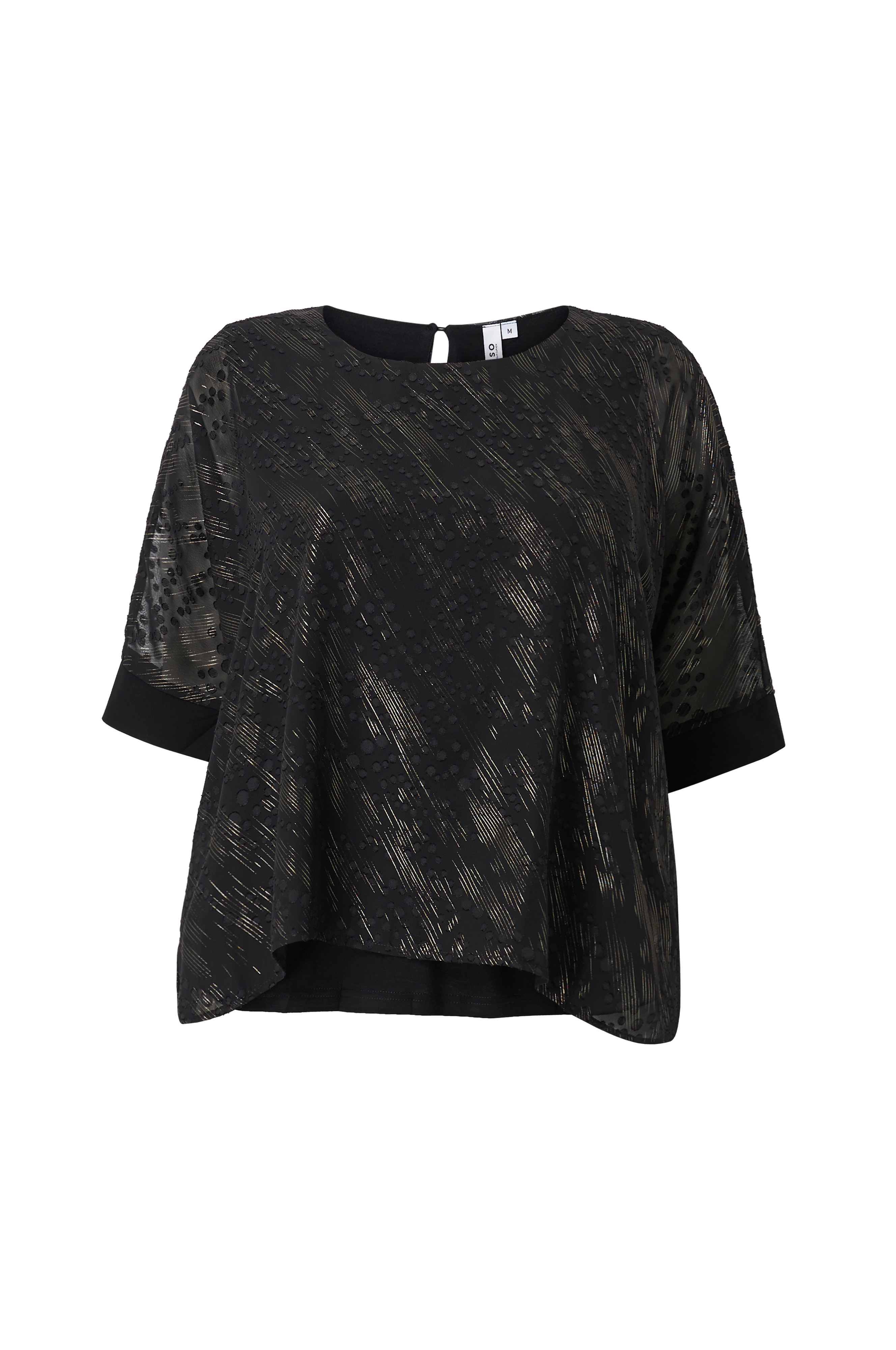 Topp från Ciso. Vid modell i chiffong med vävda strukturprickar och glittrigt mönster. Rund hals med sprund och knapp i nacken samt nerhasad axel med kort ärm som har påsydd kant i ärmslut. Foder i trikå.