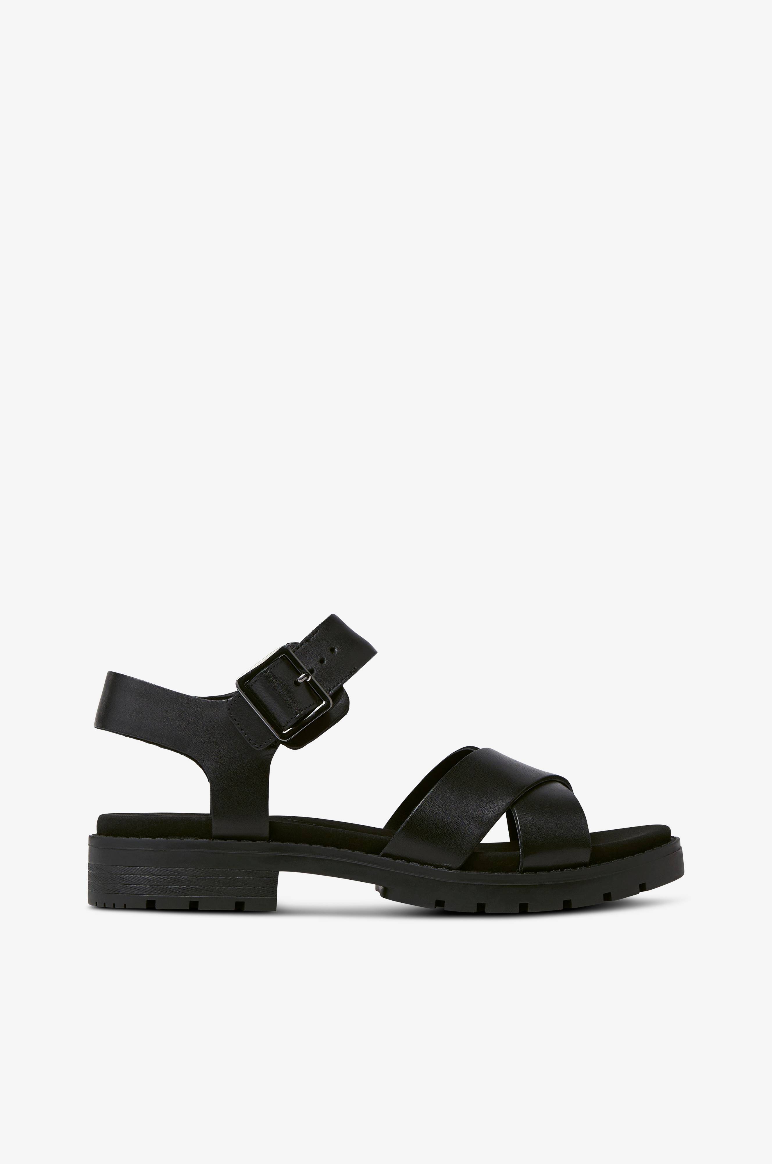 Sandaler med grov, trendig design med liten klack och grovmönstrad sula. Läderremmar över tårna och runt ankeln. Justerbart spänne på utsidan och mjuk, formad fotbädd klädd i microfiber för skön komfort. Klackhöjd ca 3 cm.