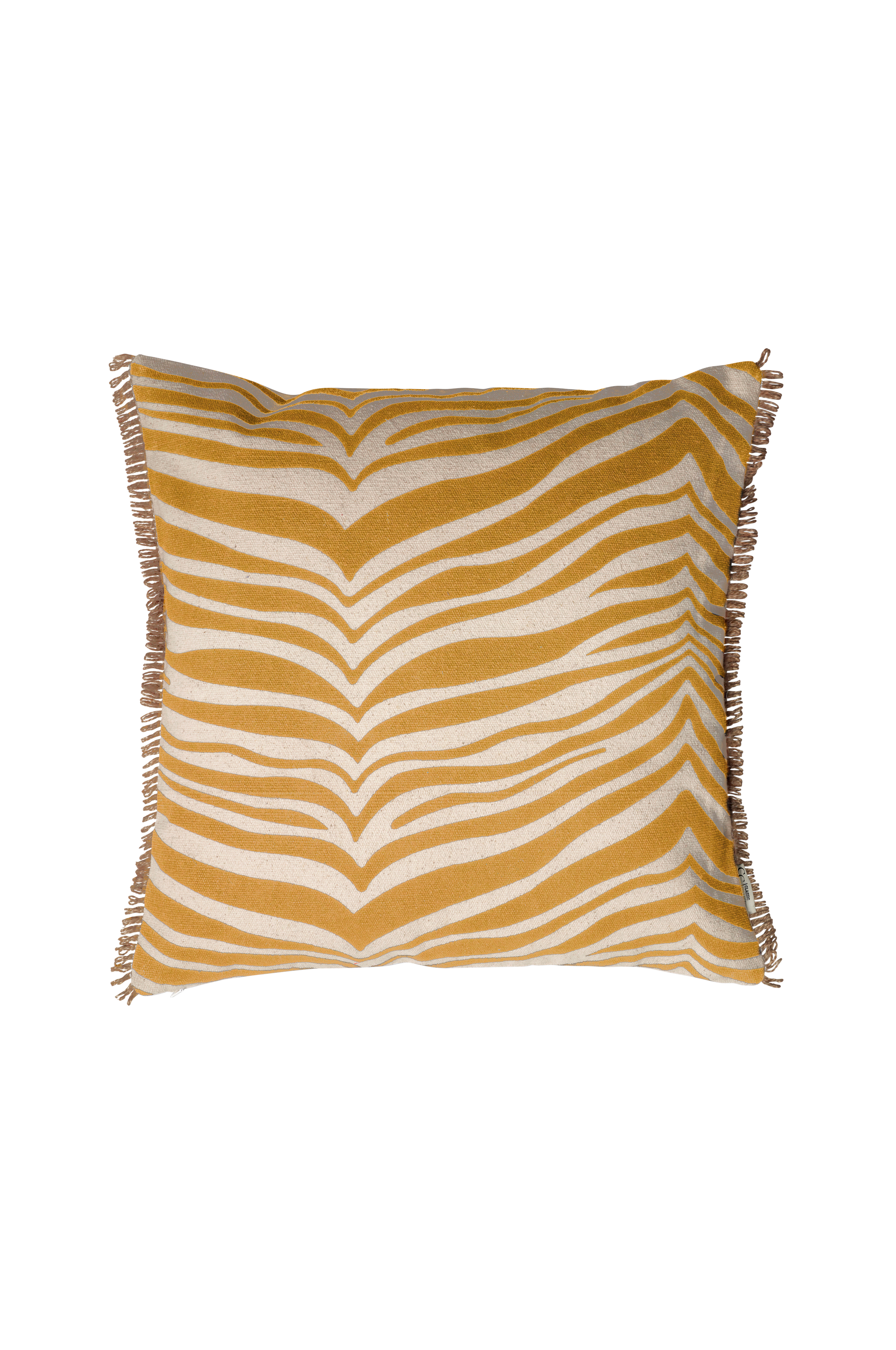 Kudde Zebra är en klassisk zebramönstrad kudde i bomull med en franskant. Kudden är tillverkad i 100% bomull och mönstret är handtryckt på kudden. Kudden har en kant av Jute, enfärgad baksida och blixtlås i sidan. Storlek 50x50.