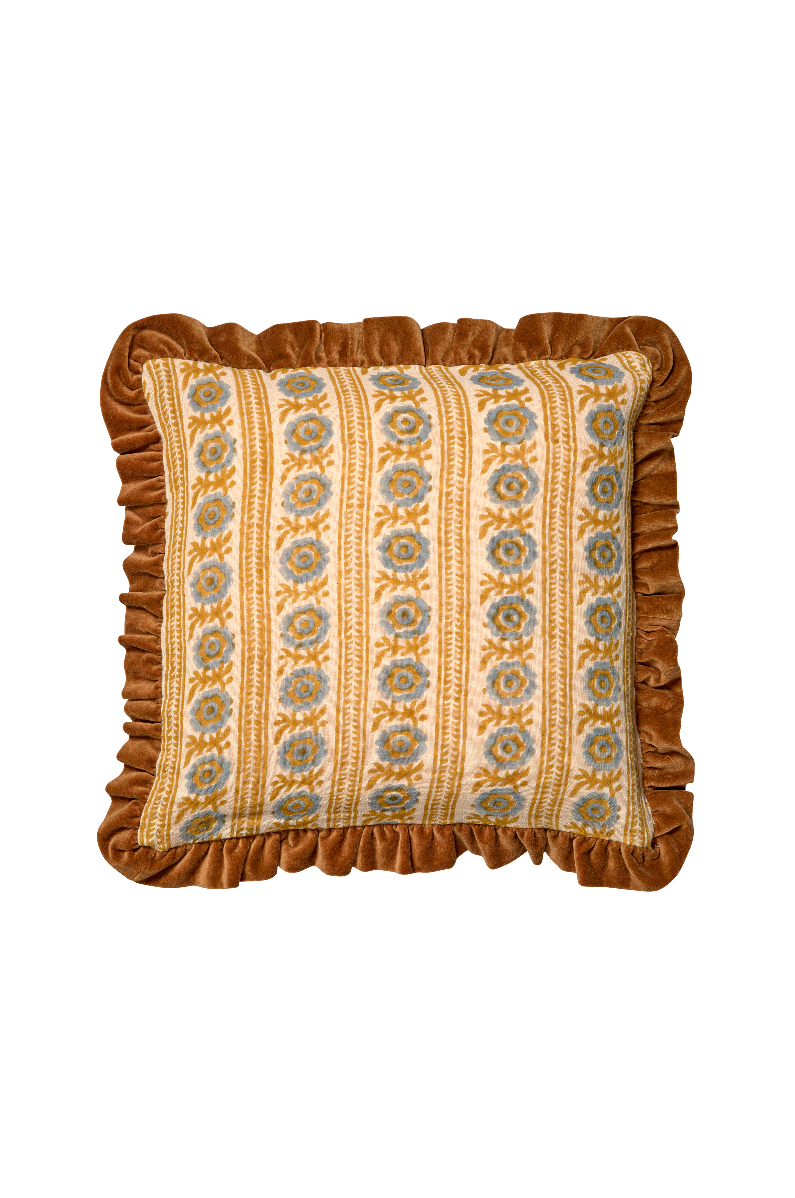 Kuddfodral i bomull med blocktryck och volangkant. Kuddfodralet Posy är tillverkat i bomull med ett dekorativt blomstermönster i blocktryck. Fodralet har en volangkant i bomullssammet som ger det en mjuk och elegant karaktär. Tack vare sin storlek passar det lika bra på soffan som på sängen.
