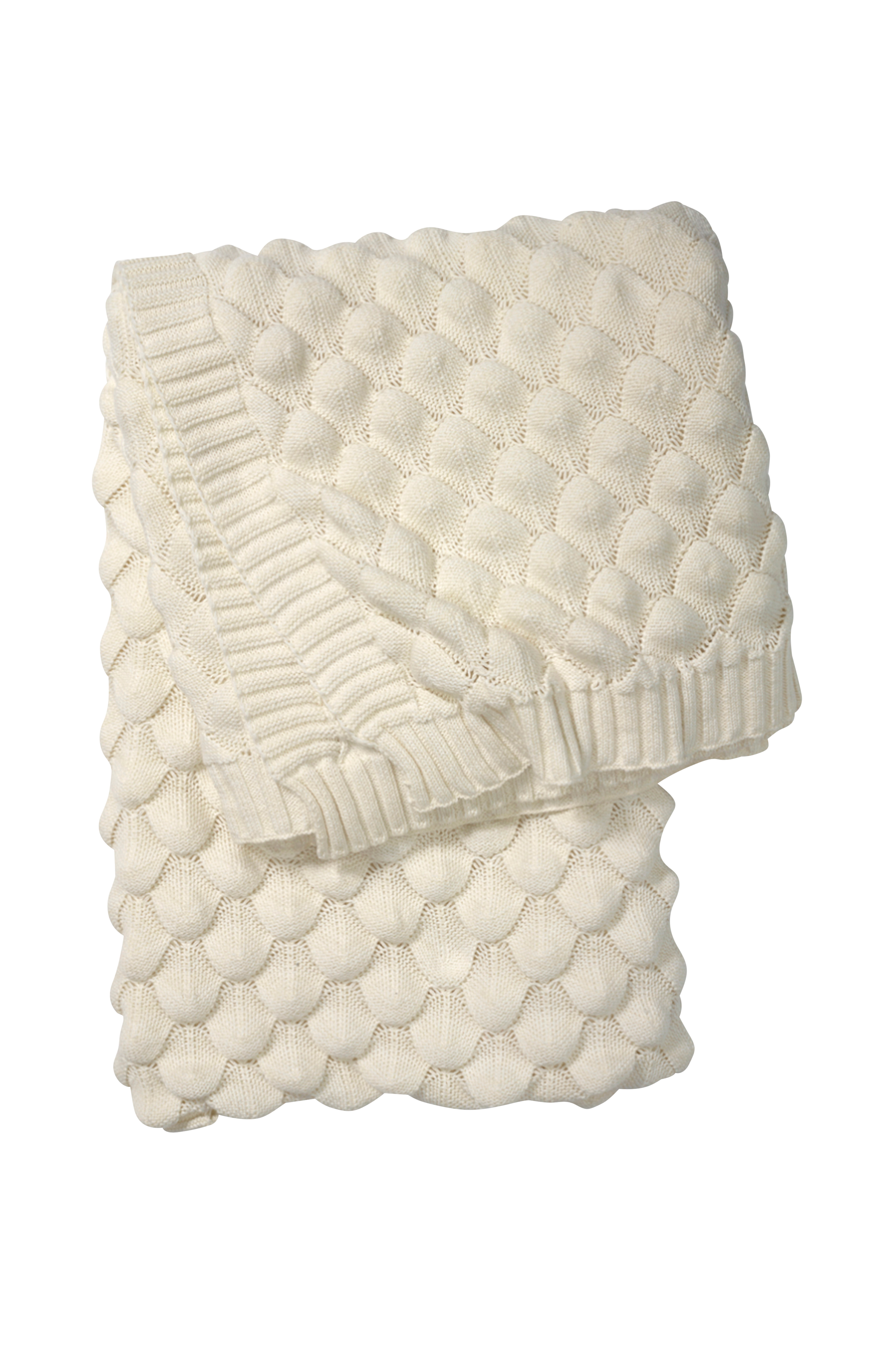 Pläd Gems är stickad i mjuk bomull. Pläden är lika fin i soffan som i sängen. Mönstret påminner om fiskfjäll. OEKO-TEX Certifierad.