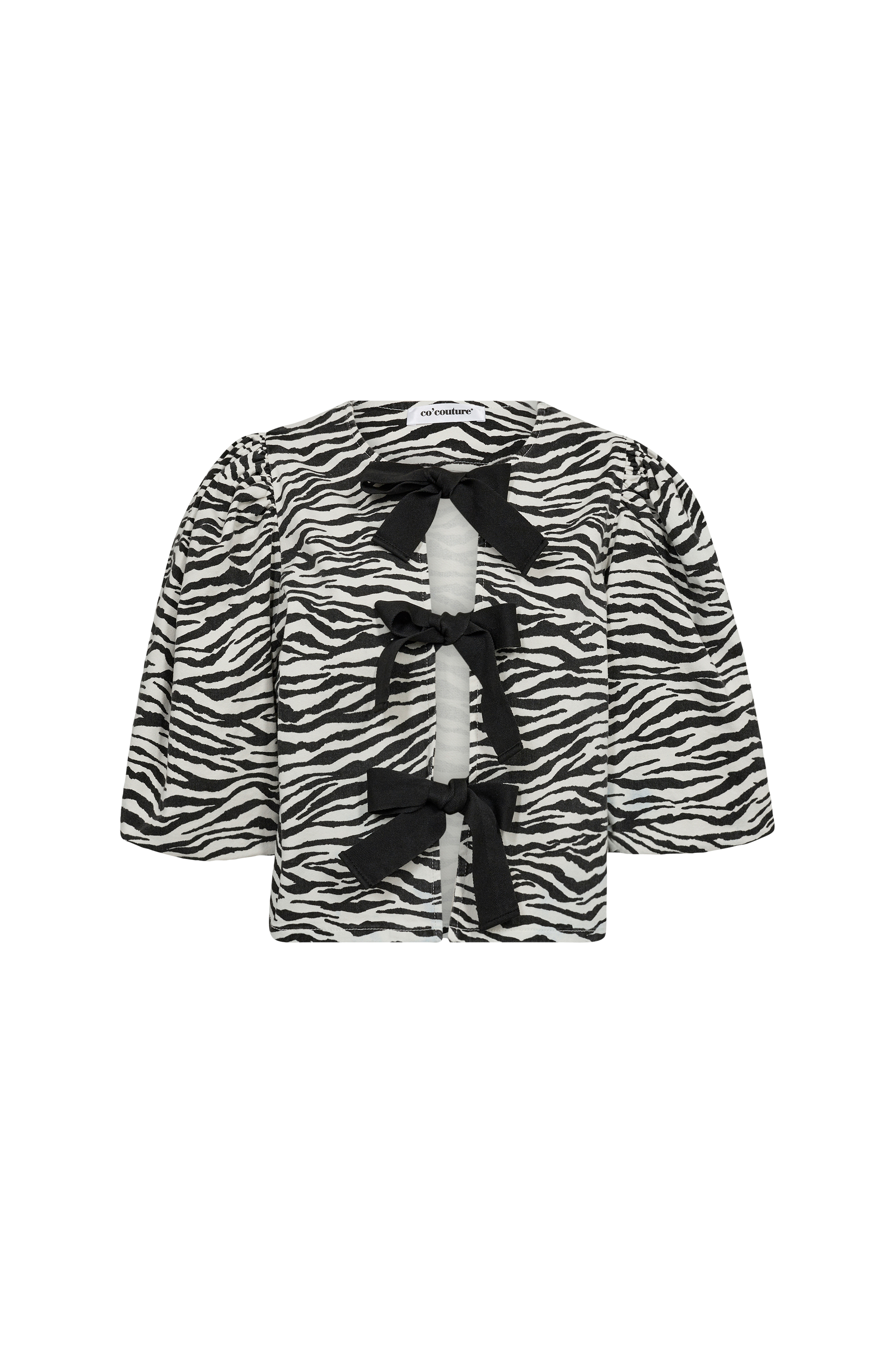 • Kort, rak modell• Rund hals• Breda knytband fram• Vid, halvlång ballongärm