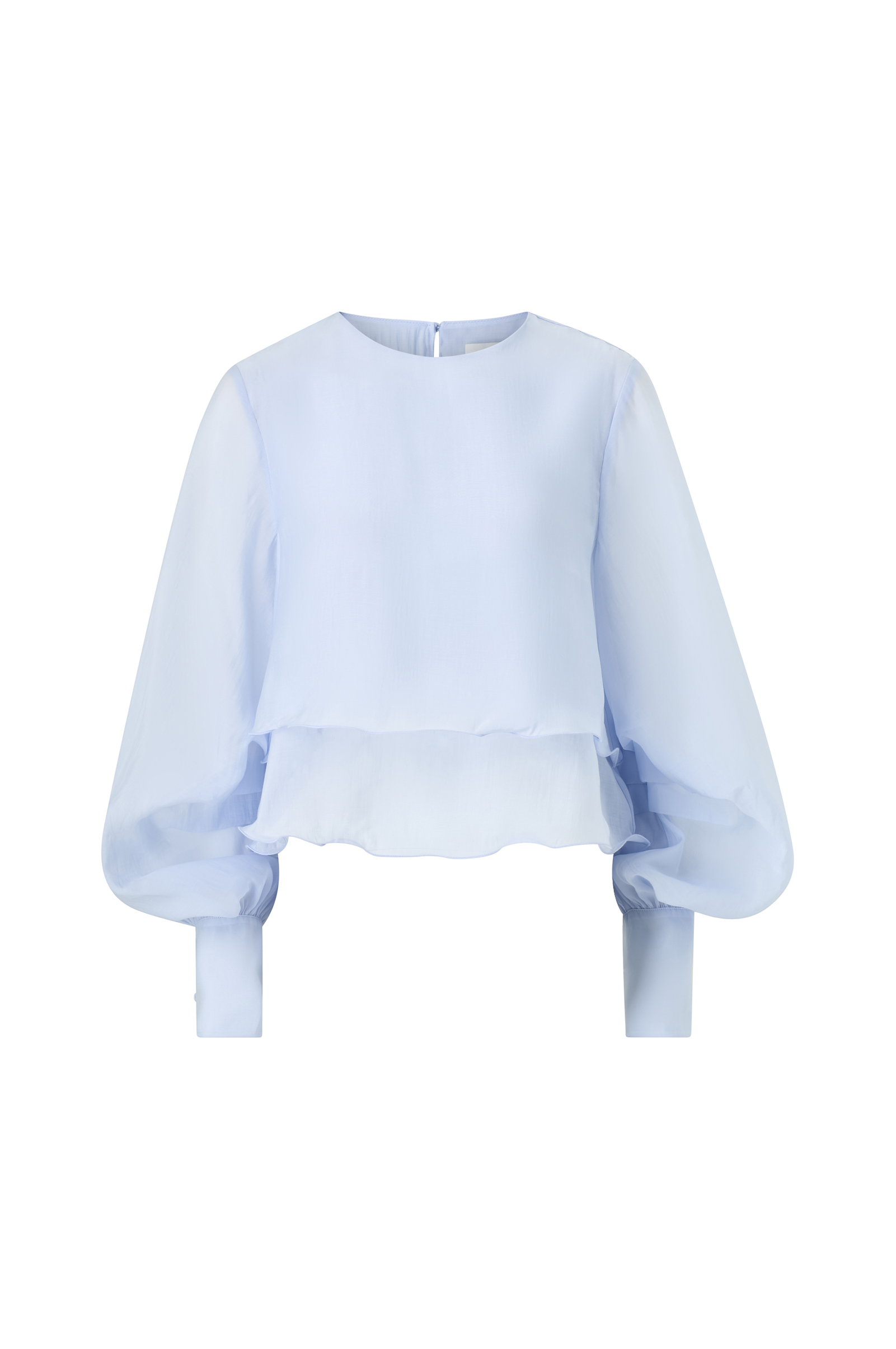 • Skir blus med volanger• Rund halsringning med nyckelhålsöppning och knapp i nacken• Långa ballongärmar med sydda, dekorativa veck och breda manschetter