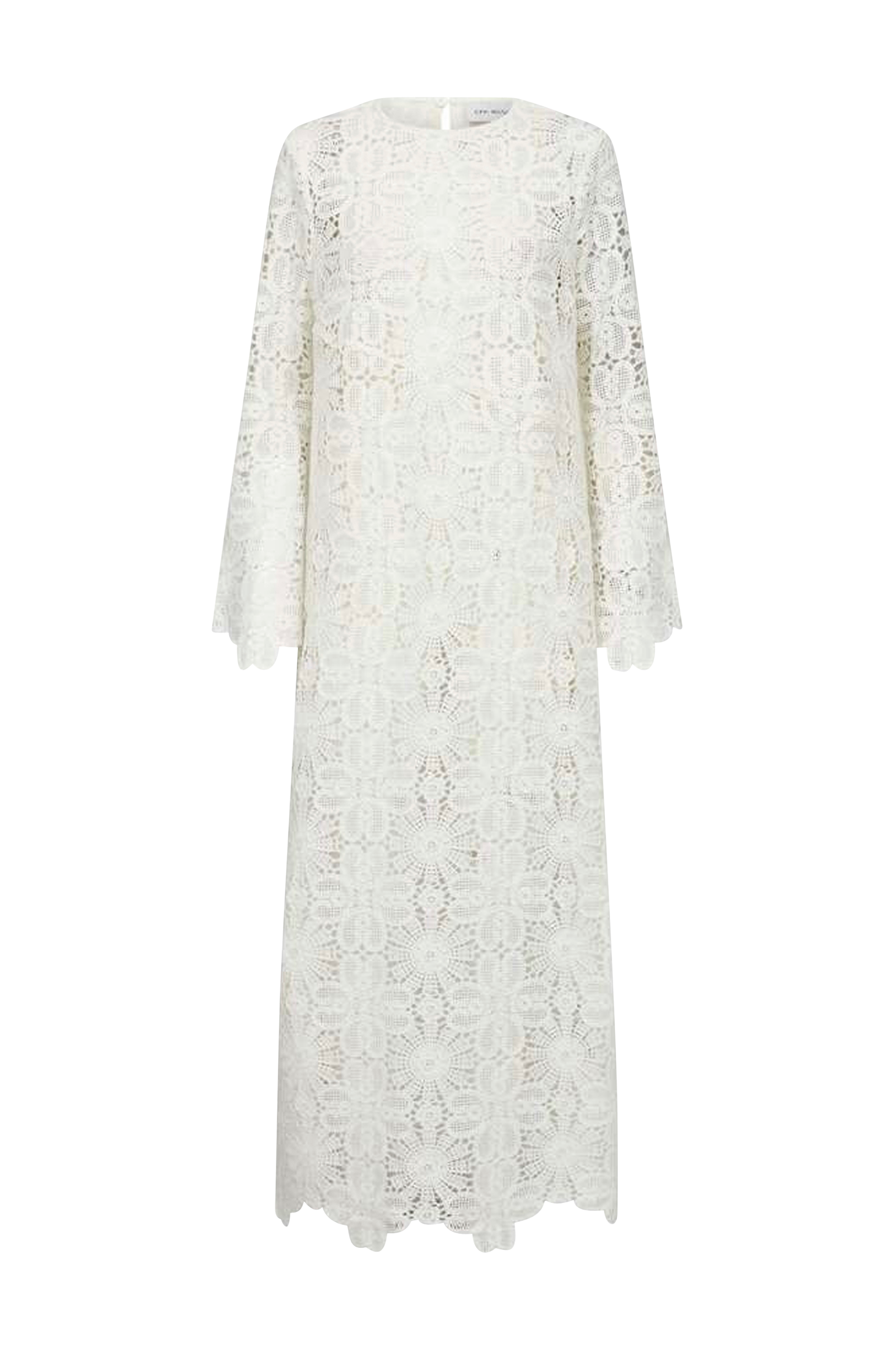 • Lång, hålmönstrad klänning• Rund halsringning• Nyckelhålsöppning i nacken med knäppning• Långa ärmar• Slits nedtill i ena sidan• Längd: 141 cm i storlek S