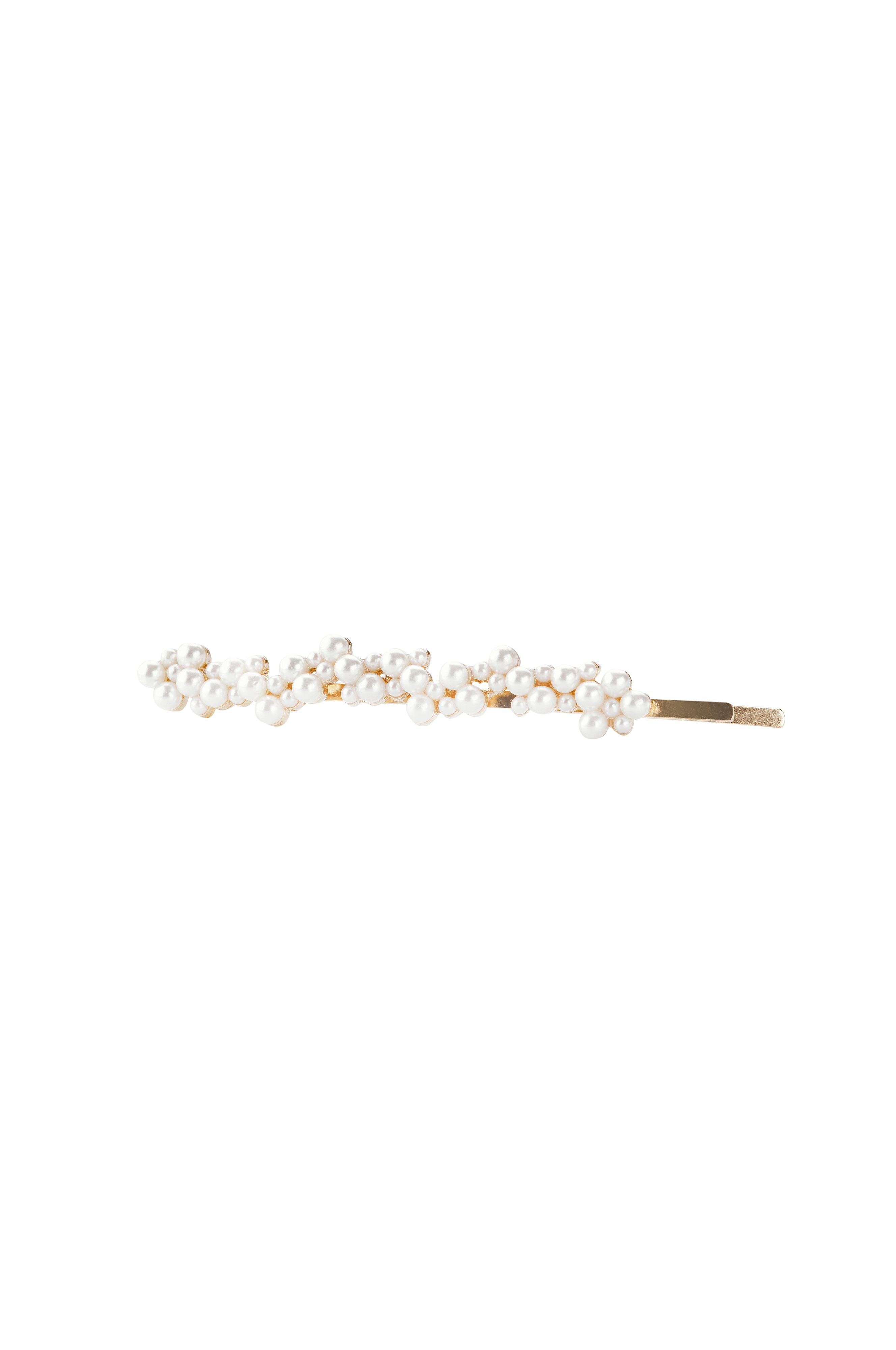 En slider i guldpläterad metall med vita plastpärlor. Bredd 1,5 cm, längd 9 cm.