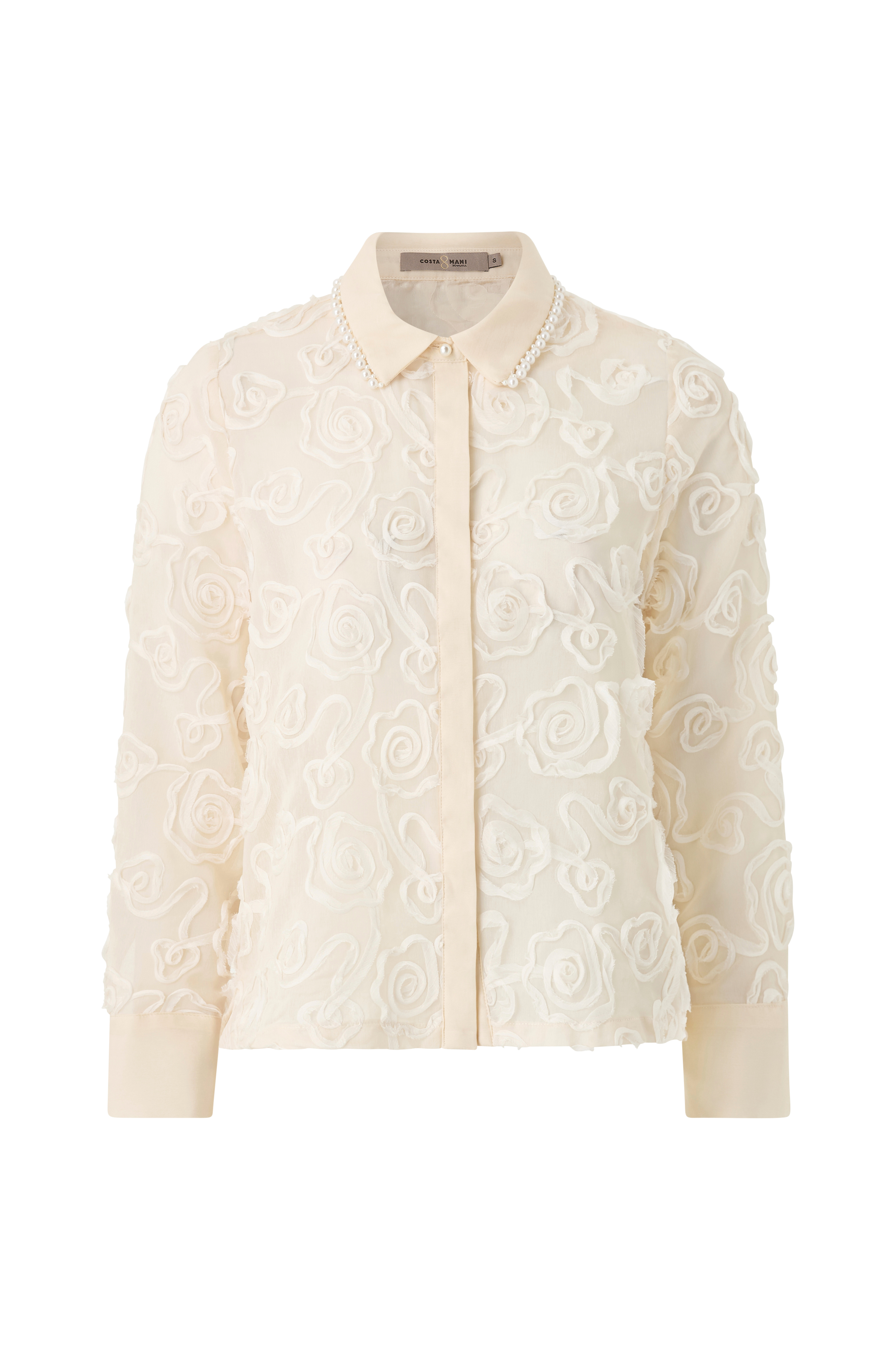 • Transparent skjorta med applikationer över hela• Påsydda pärlor på kragen• Dold knappslå• Sprund nedtill i sidorna• Manschetter med pärlknapp i ärmsluten