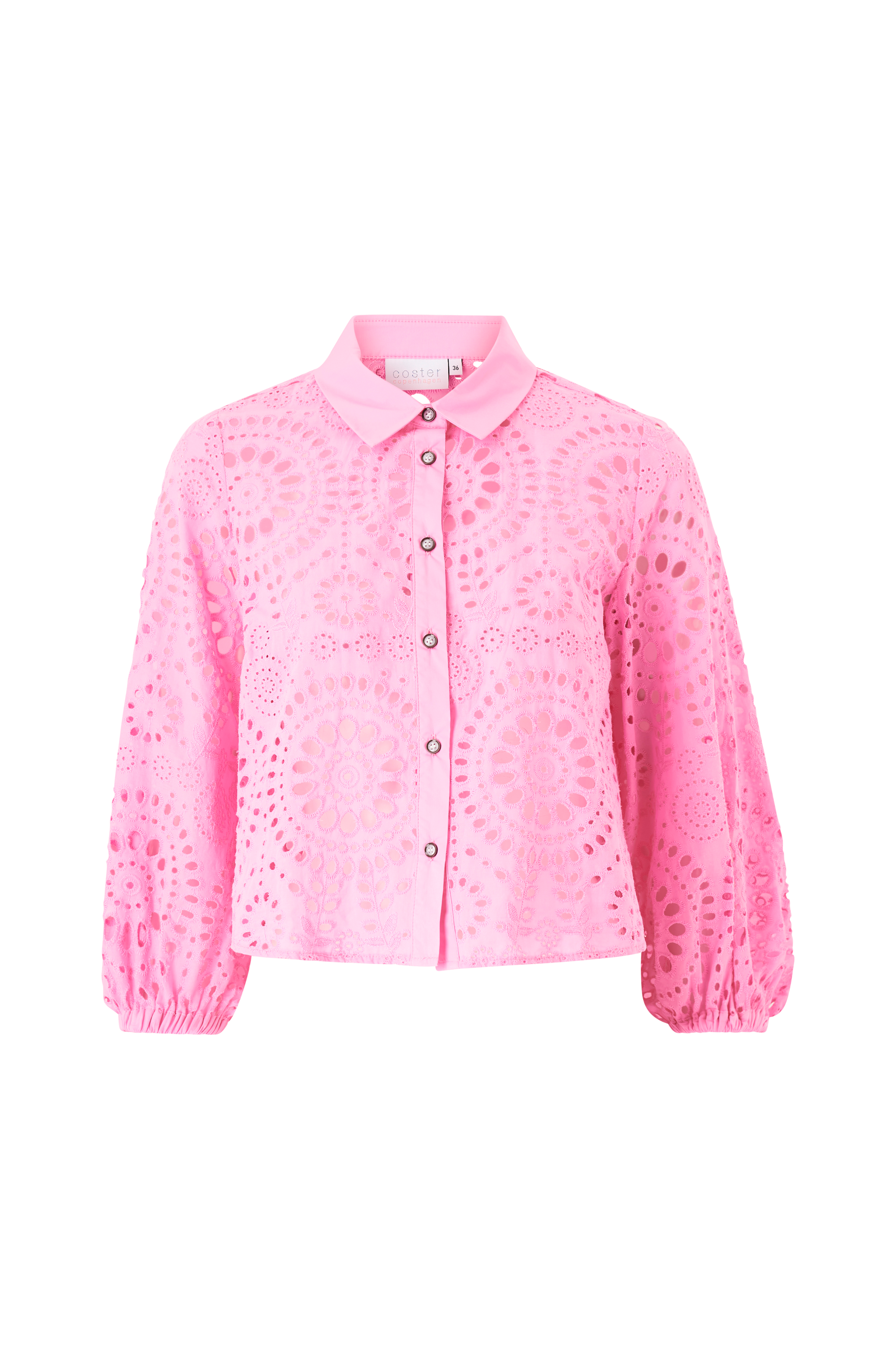 Blus i kort, vid modell med broderat hålmönster. Knappar fram och 3/4-långa ballongärmar med elastiska ärmslut.