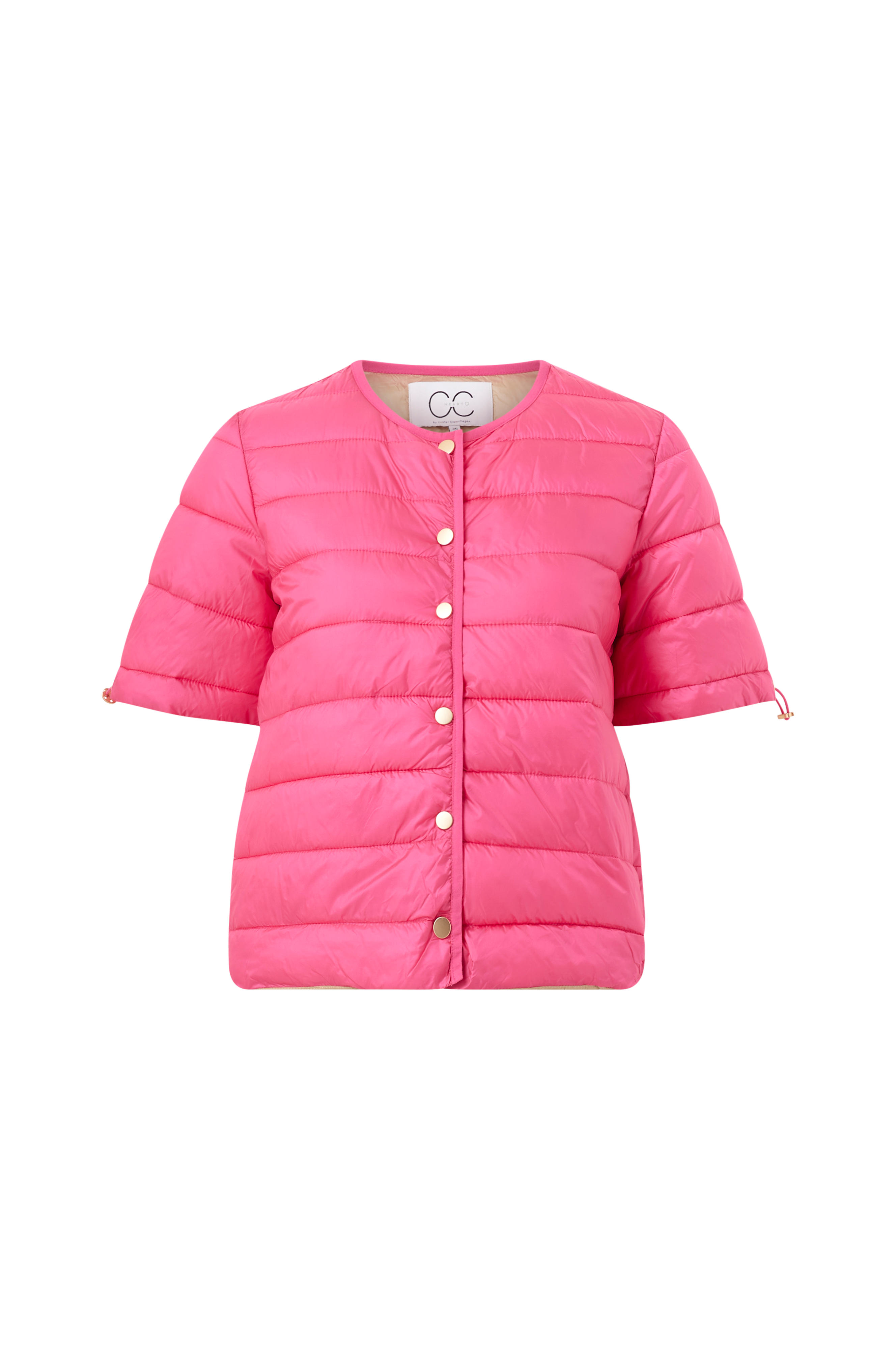 Quiltad och lätt vadderad jacka med korta ärmar med dragsko i ärmsluten. Tryckknappar fram och fickor i sidorna. Längd ca 65 cm i stl 36.