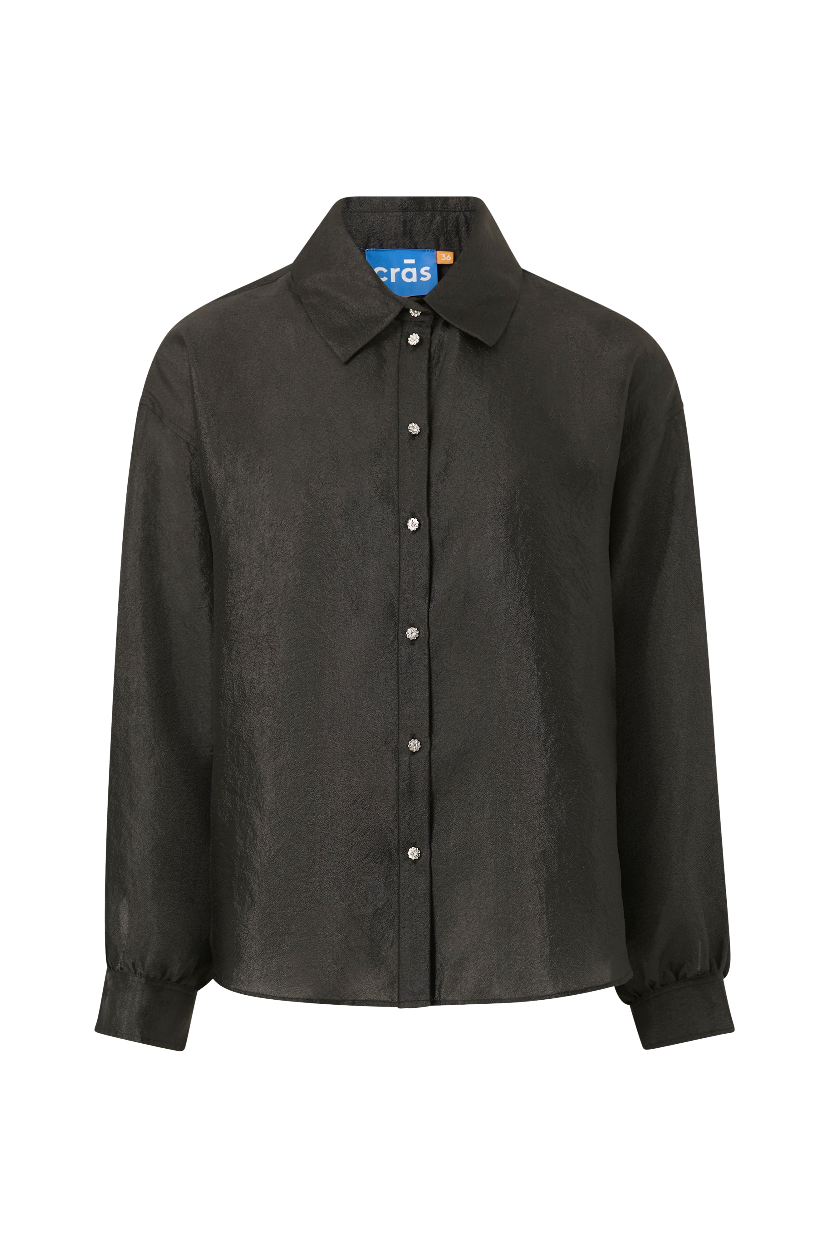 • Knappar med strass fram • Nerhasade axlar • Ballongärmar med manschett • Tunn kvalitet med lyster • Lös passform • Produkten innehåller återvunnet material som har tagits tillvara för att minska mängden avfall, samtidigt som nya resurser inte har förbrukats.