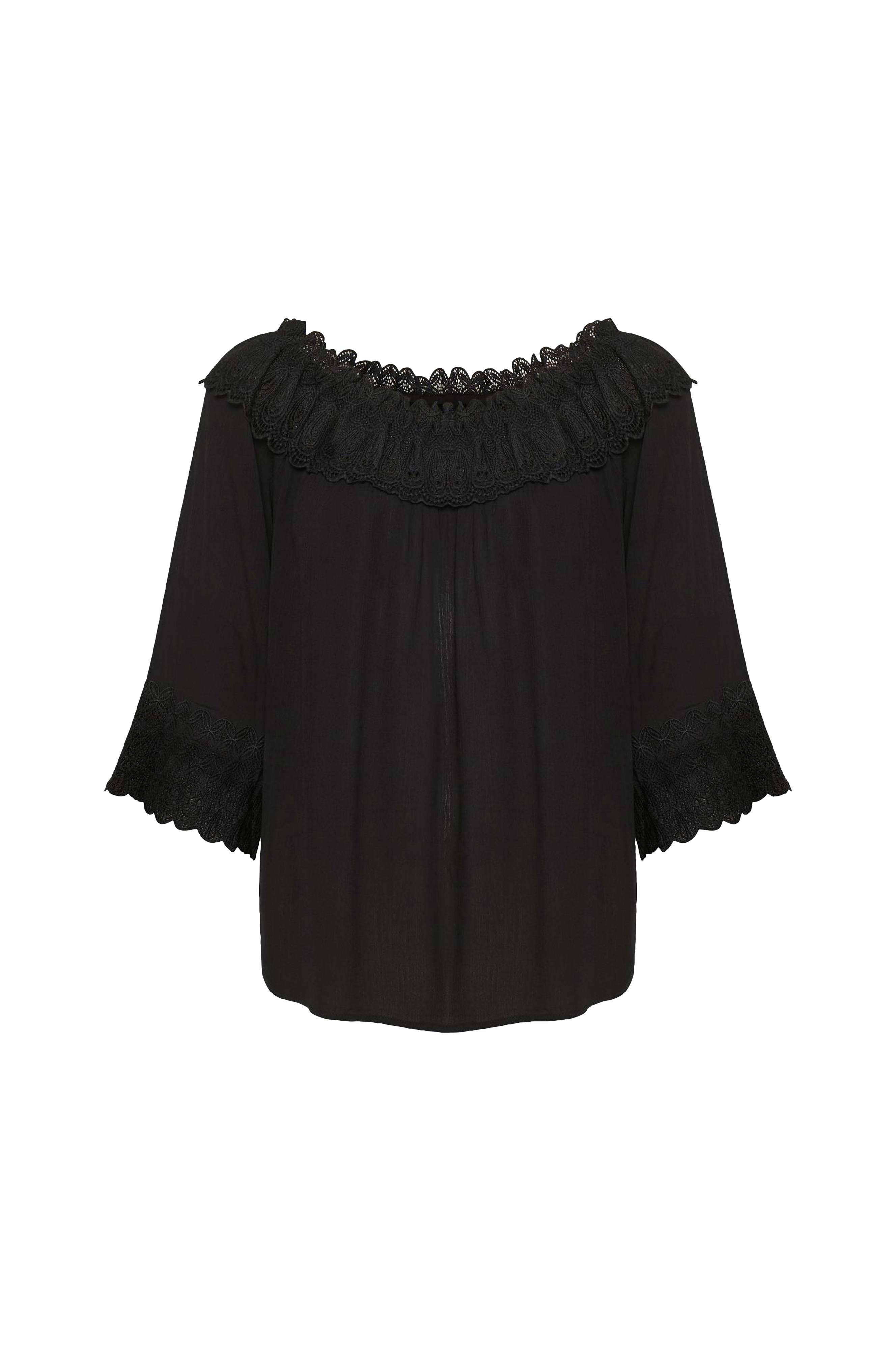 Blus i tunn, vävd viskos med krinklad struktur. Singoallamodell med vid, elastisk halsringning med bred, virkad spetskant. 3/4-långa ärmar med spets i ärmsluten.