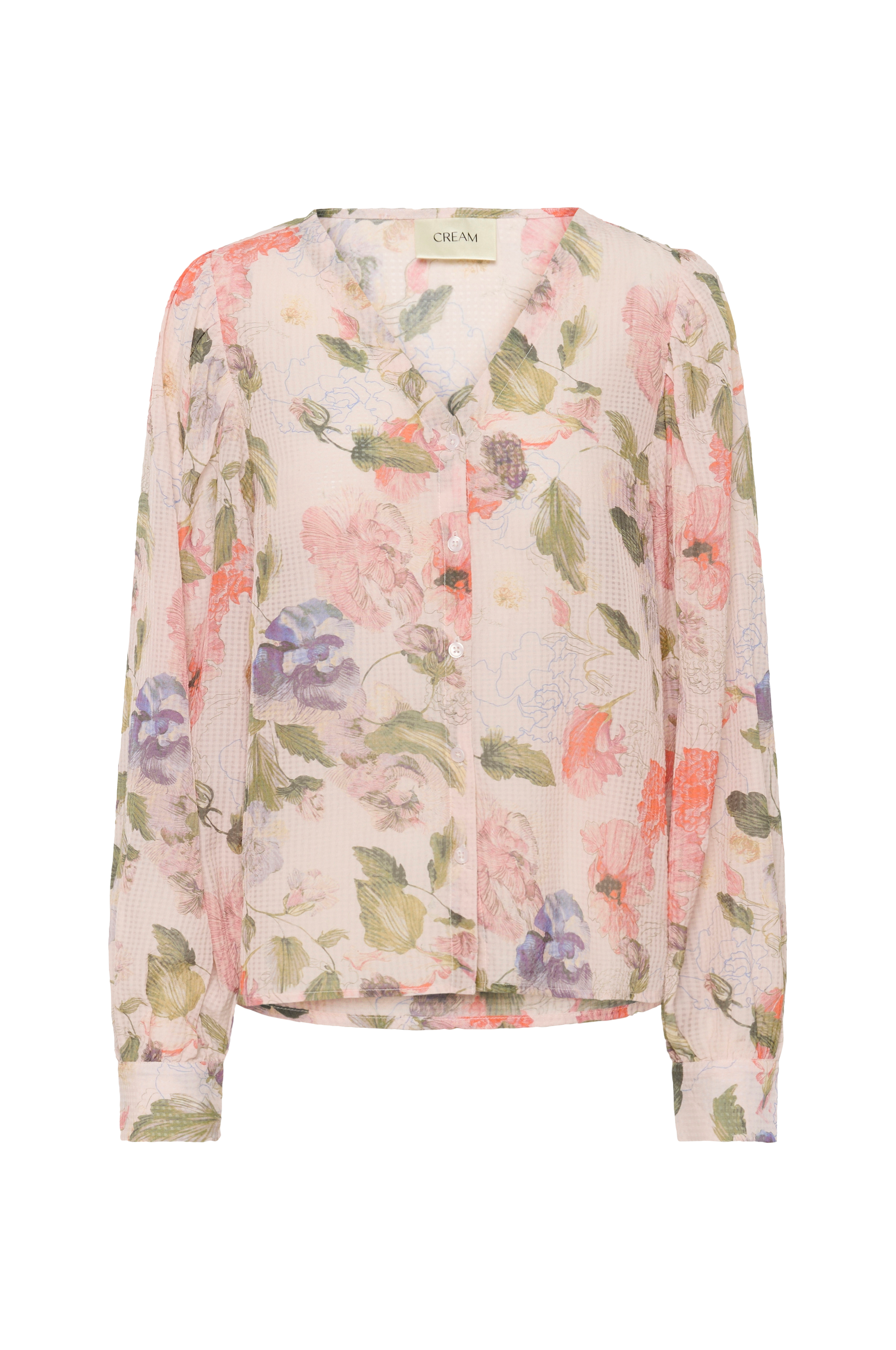 • Mönstrad blus i semitransparent seersucker• V-ringad hals• Knappar fram• Långa puffärmar med manschetter i ärmsluten