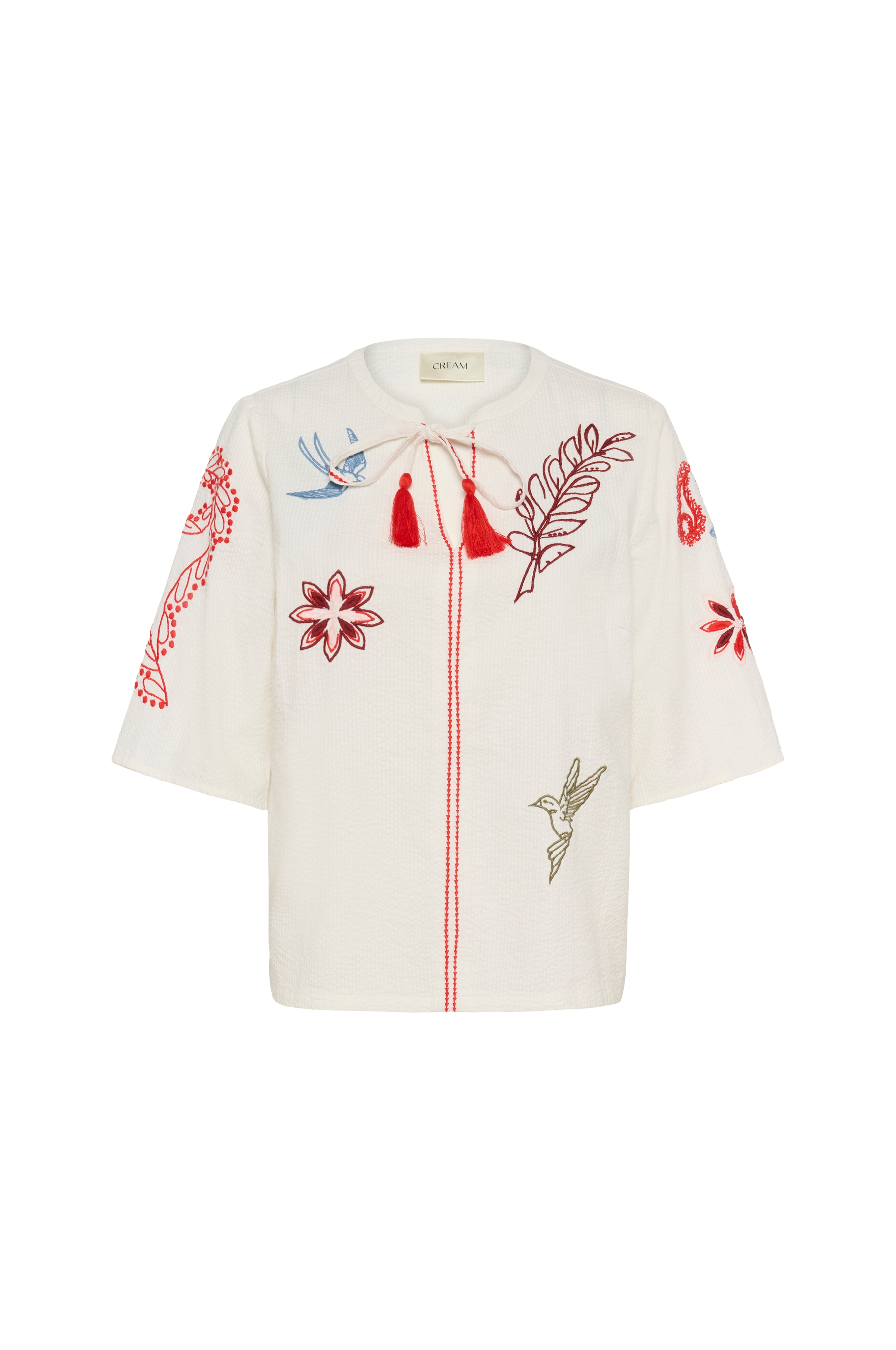 • Blus i bäckebölja med broderier• V-ringning med knytband med tofsar• Halvlånga ärmar