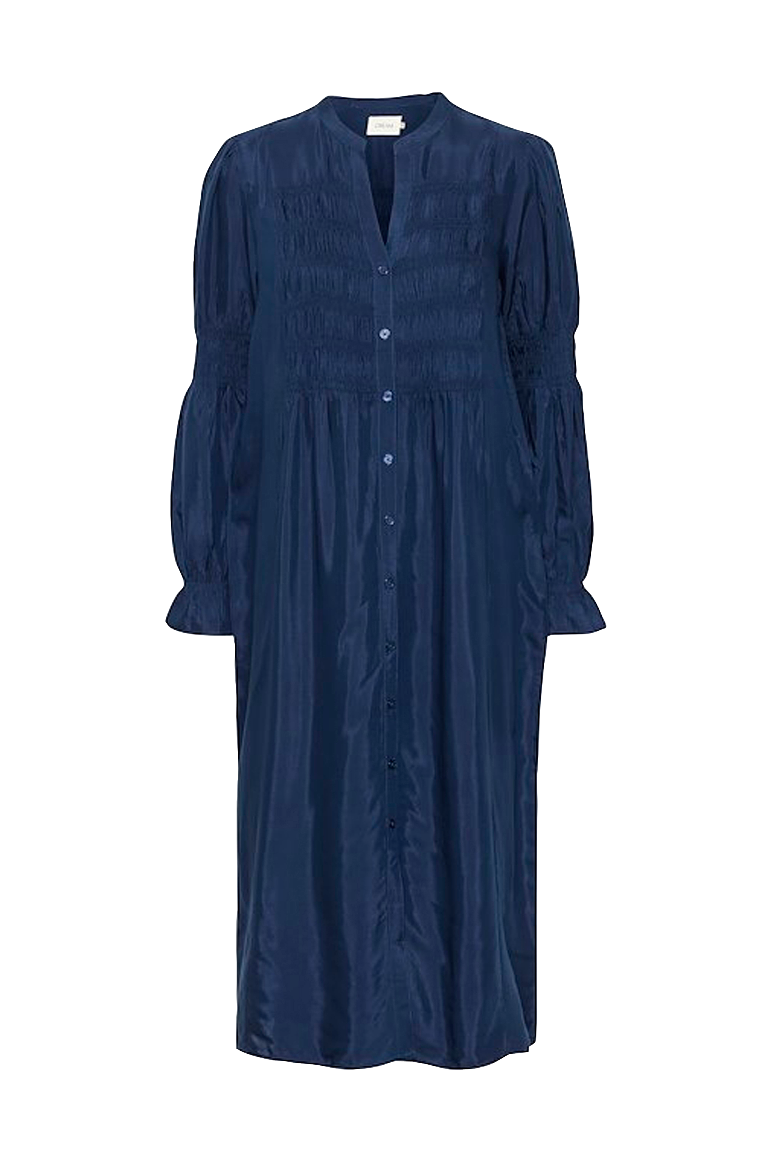 • Klänning i viskos• Knappar hela vägen fram• Smockade partier upptill fram, upptill bak och på ärmarna• Långa ärmar• Resår med volang i ärmsluten• Längd: 122 cm i storlek 36