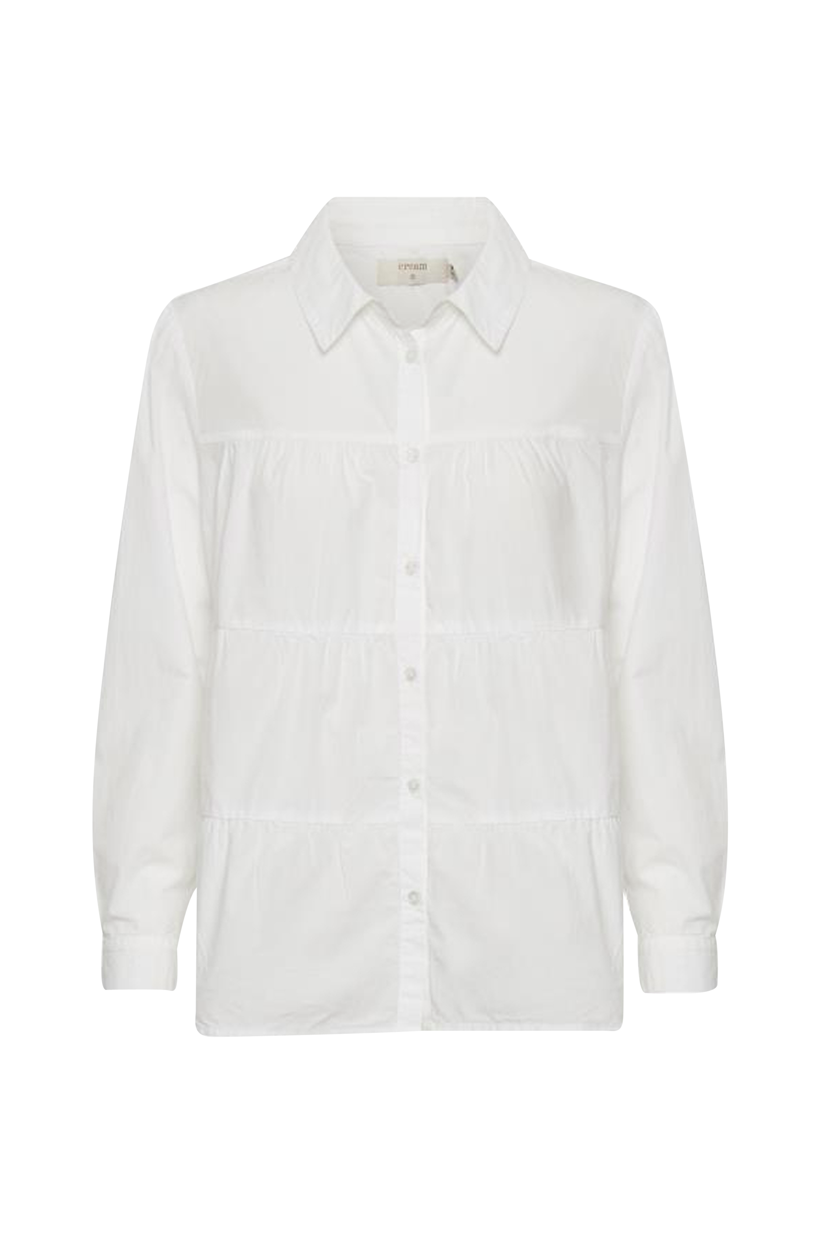Skjorta i utsvängd oversizemodell med rynkade infällningar runt om. Liten skjortkrage och knäppning fram samt lång ärm med rynk vid axeln och manschett i ärmslut.