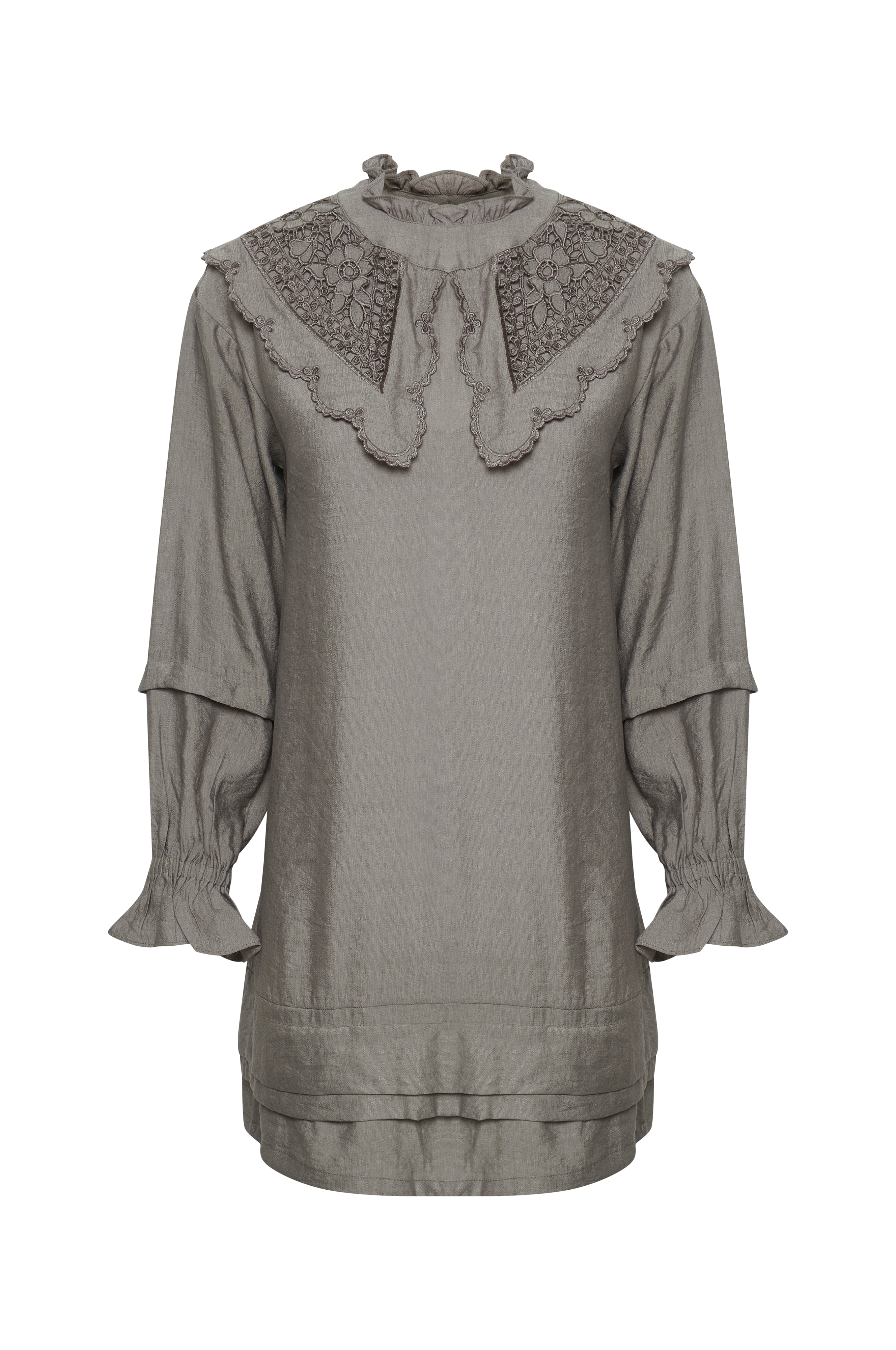 • Lätt, utsvängd modell• Stor krage i spets• Rund hals med volang• Knappar i nacken• Lång ärm med tygveck• Elastiskt ärmslut• Dubbla tygveck nedtill• Längd: 89 cm i storlek 36