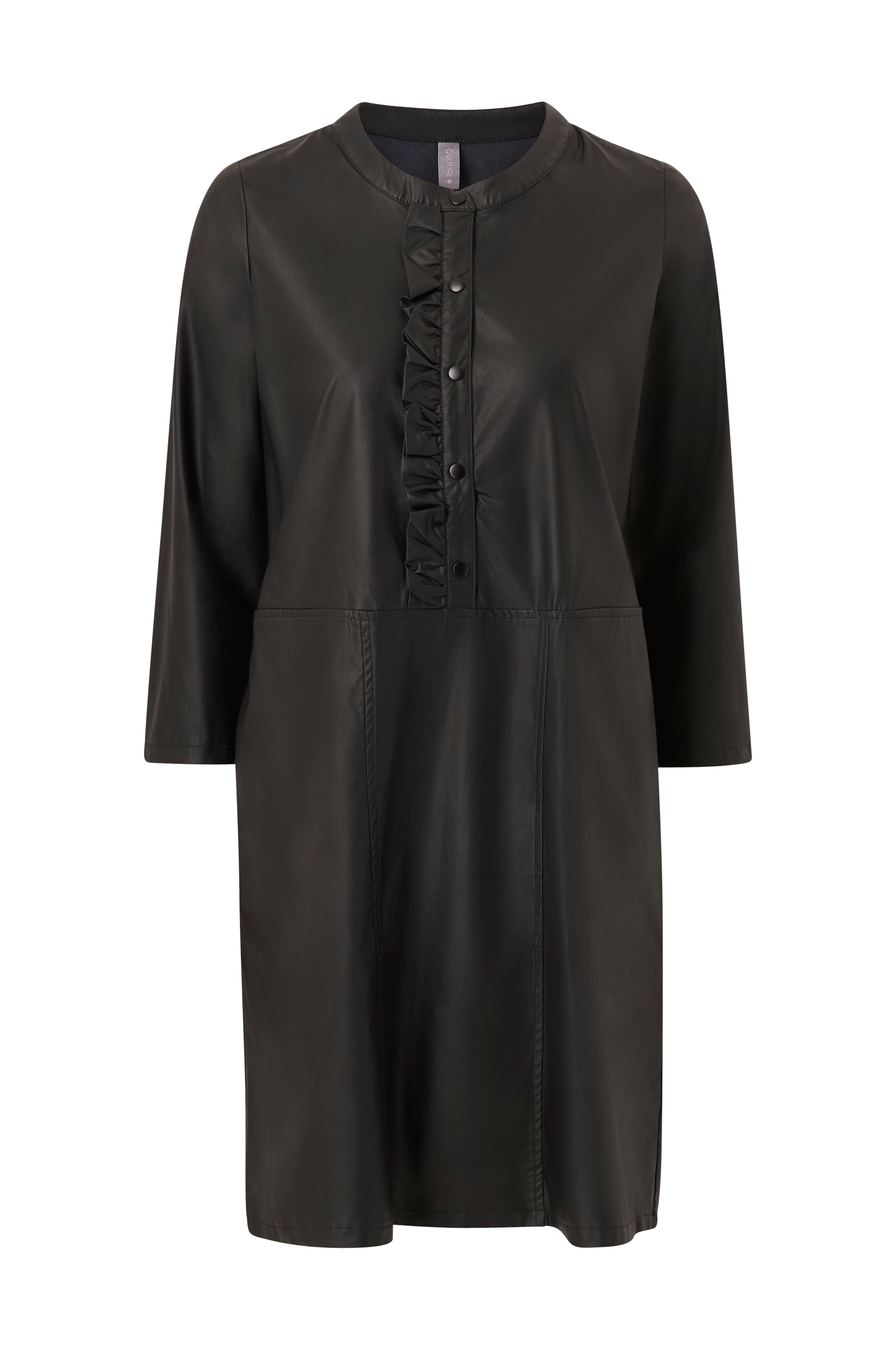 • Klänning i skinnimitation• Tryckknappar upptill fram• 3/4-långa ärmar med sprund• Volang fram• Längd: 94 cm i storlek S