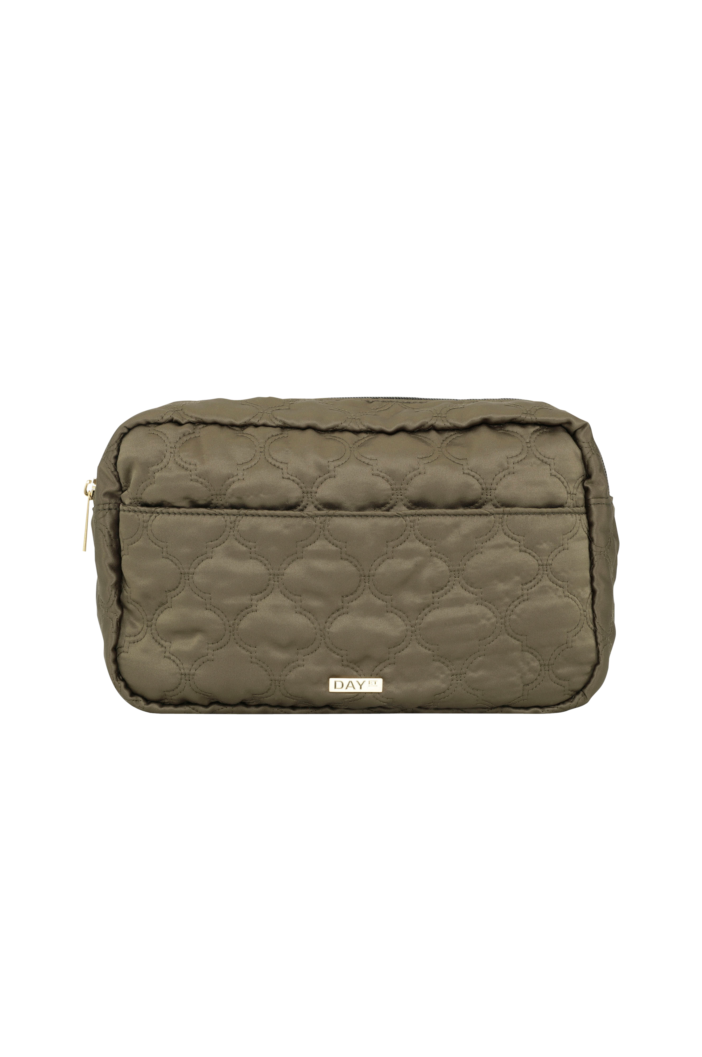 Väska / sminkväska i quiltad textil. En ytterficka med magnetknapp. Huvudfacket stängs med dragkedja. Invändigt finns fyra öppna fickor. Mått: B29 x H17 x D8 cm.