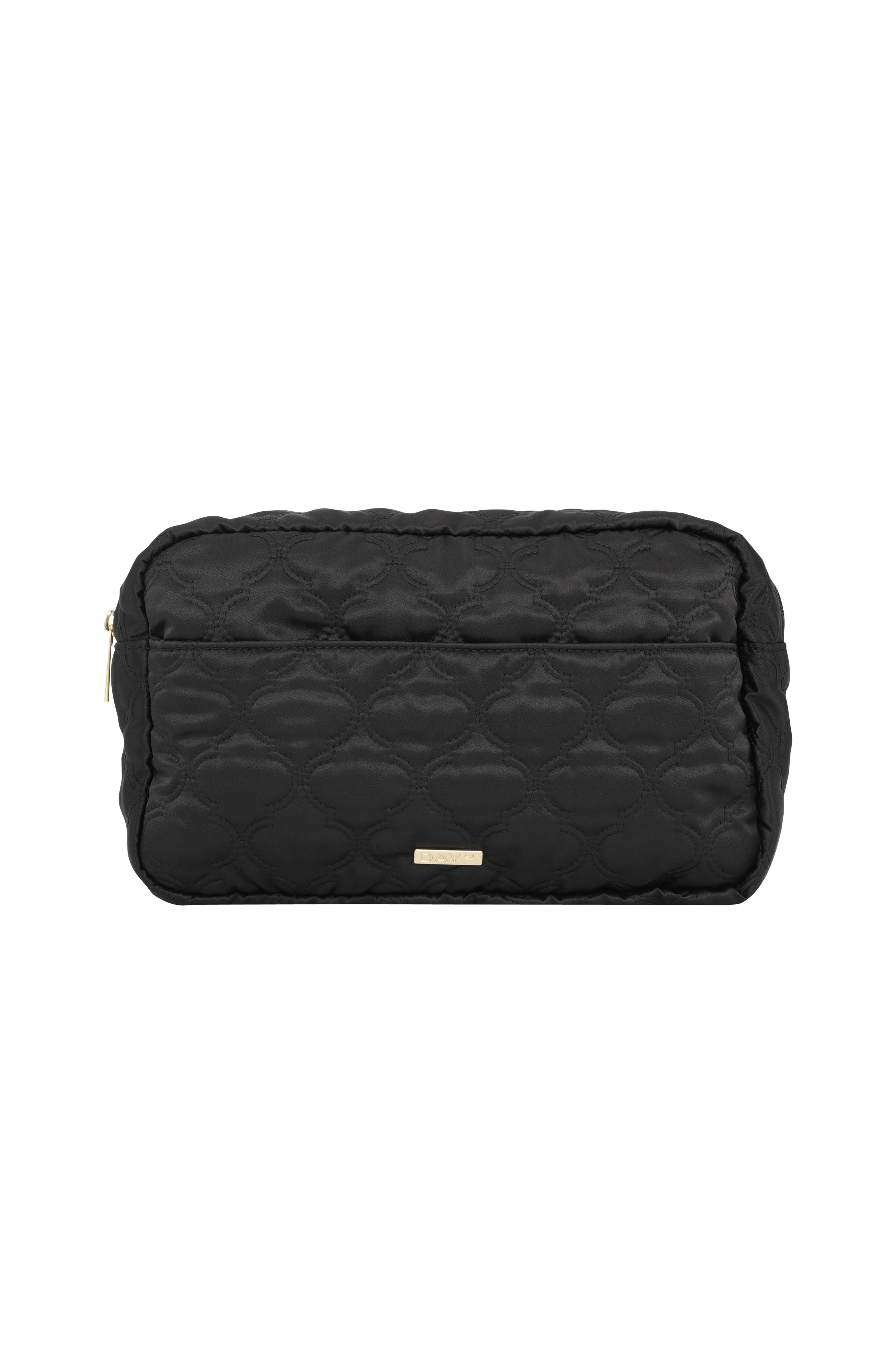 Väska / sminkväska i quiltad textil. En ytterficka med magnetknapp. Huvudfacket stängs med dragkedja. Invändigt finns fyra öppna fickor. Mått: B29 x H17 x D8 cm.