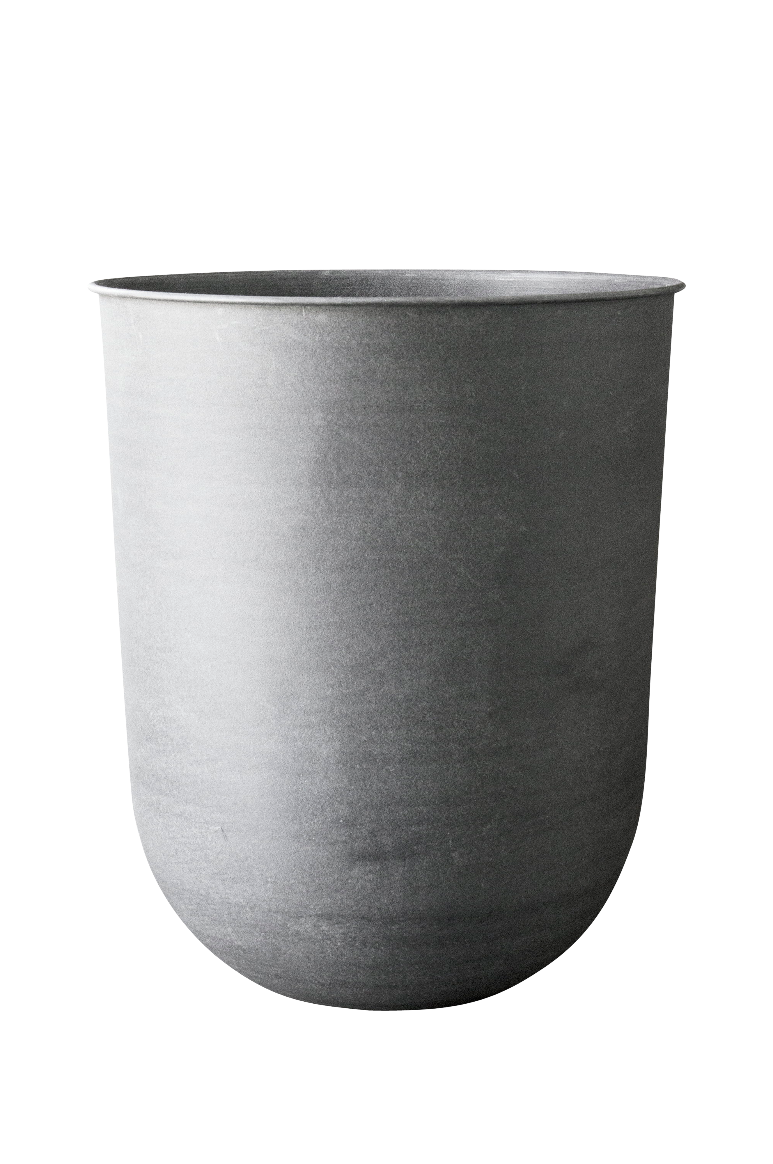 Out Pot XL. Out är en elegant serie gjord av glaserad plåt, vilket innebär att den kan stå utomhus året runt. I botten finns ett dräneringshål som förhindrar att krukorna fylls med vatten. Detta hål kan också stängas med medföljande kork av plast. Diameter 60 cm och höjd 60 cm.