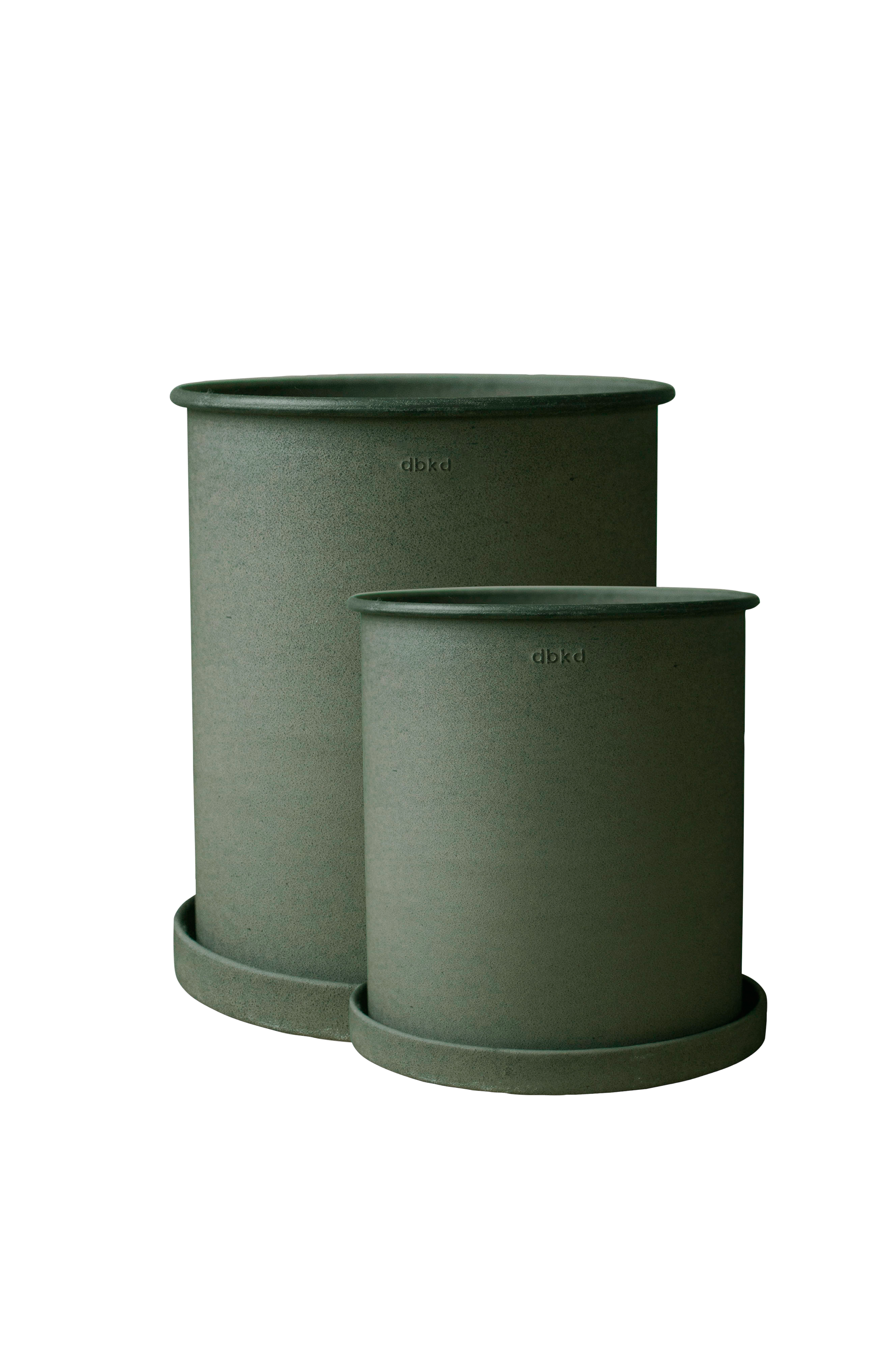 Plant - en serie krukor och skålar med passande fat formgivna av Dbkd. Tillverkade av glaserad plåt vilket gör dem lätta att hantera. I botten finns ett dräneringshål som hindrar växterna från att bli övervattnade. Detta hål kan stängas med ett bifogat plastlock om så önskas, det gör det dock inte 100% vattentätt, läckage kan förekomma. Ytan kommer att patineras med tiden. Finns i flera storlekar och färger. Höjd 30, 40 cm (Ø 27 / 36 cm)