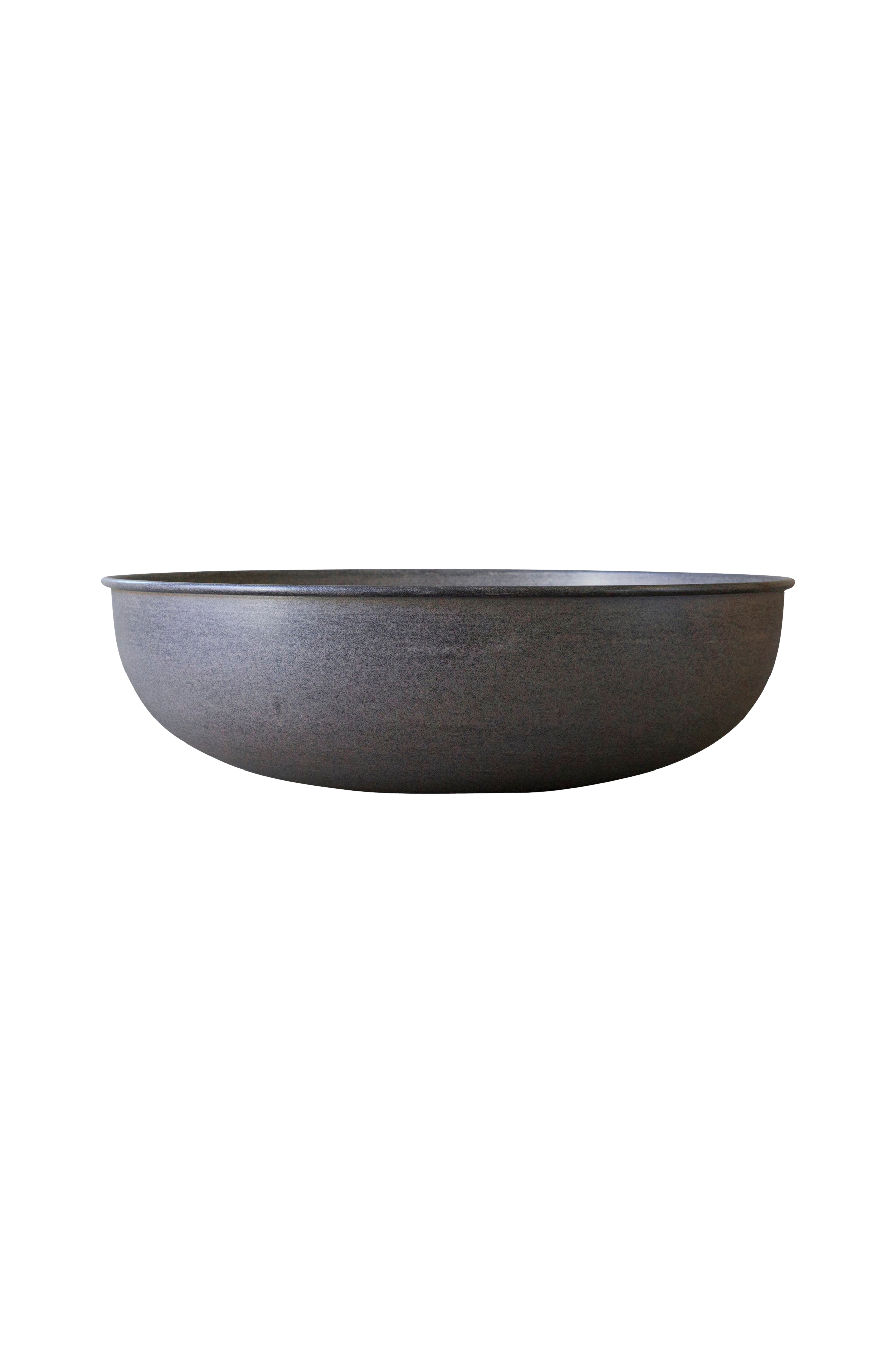 Skål Out large. Out är en elegant serie gjord av glaserad plåt, vilket innebär att den kan stå utomhus året runt. I botten finns ett dräneringshål som förhindrar att krukorna fylls med vatten. Detta hål kan också stängas med medföljande kork av plast. Diameter 50 cm och höjd 16 cm.