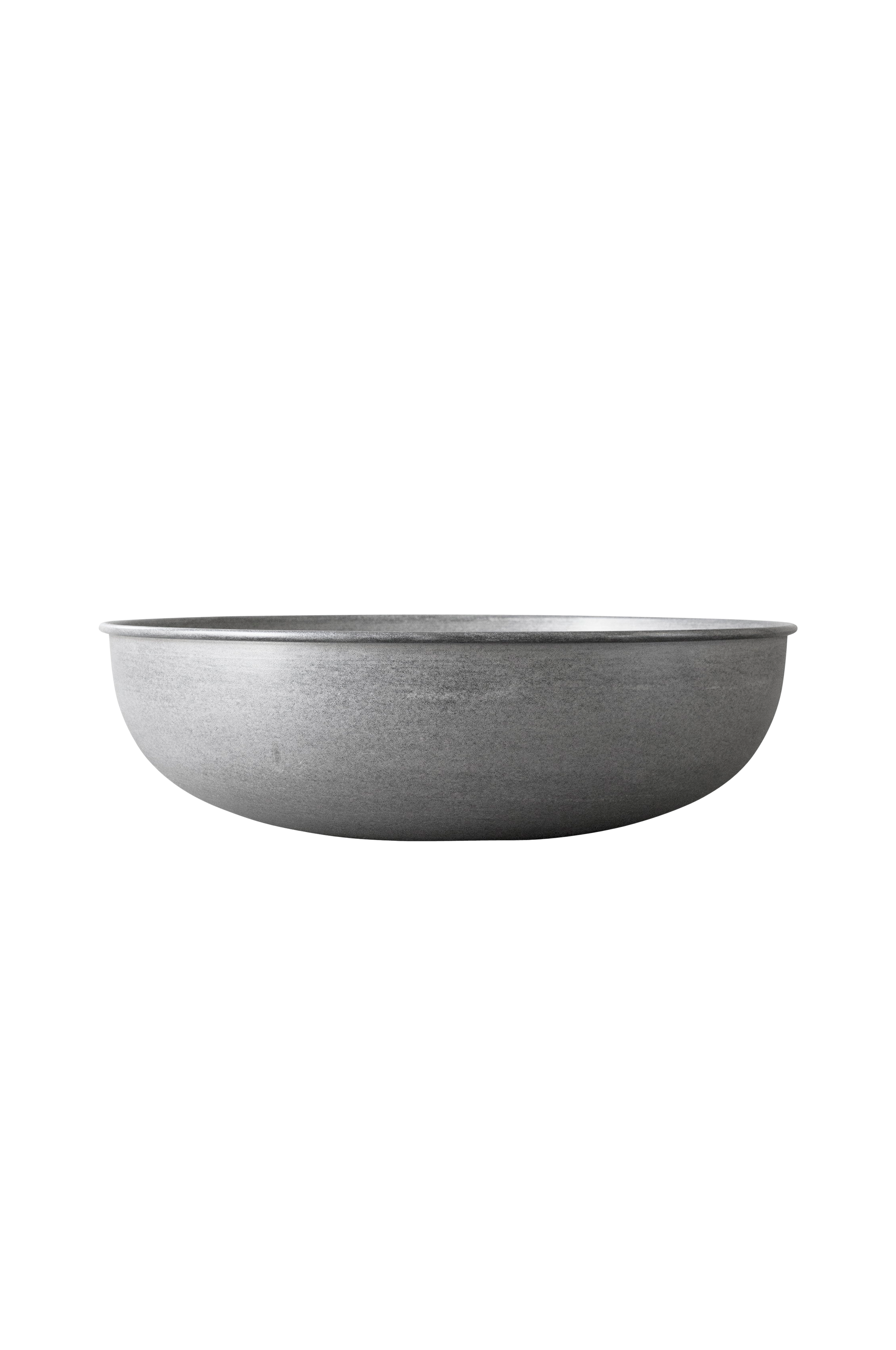 Skål Out medium. Out är en elegant serie gjord av glaserad plåt, vilket innebär att den kan stå utomhus året runt. I botten finns ett dräneringshål som förhindrar att krukorna fylls med vatten. Detta hål kan också stängas med medföljande kork av plast. Diameter 40 cm och höjd 13 cm.