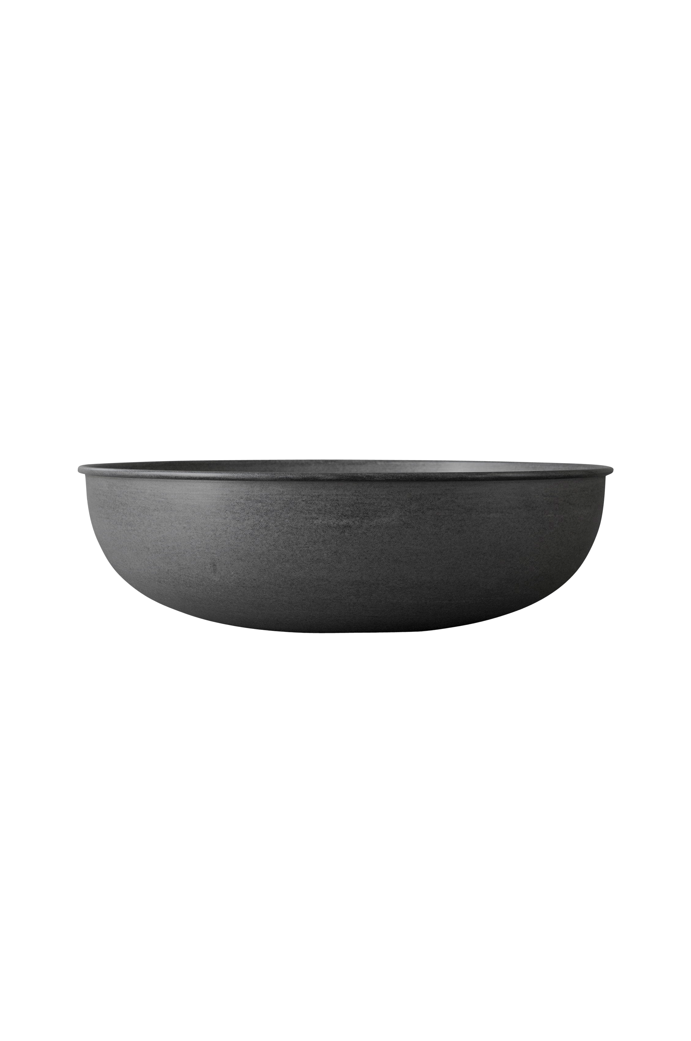 Skål Out medium. Out är en elegant serie gjord av glaserad plåt, vilket innebär att den kan stå utomhus året runt. I botten finns ett dräneringshål som förhindrar att krukorna fylls med vatten. Detta hål kan också stängas med medföljande kork av plast. Diameter 40 cm och höjd 13 cm.