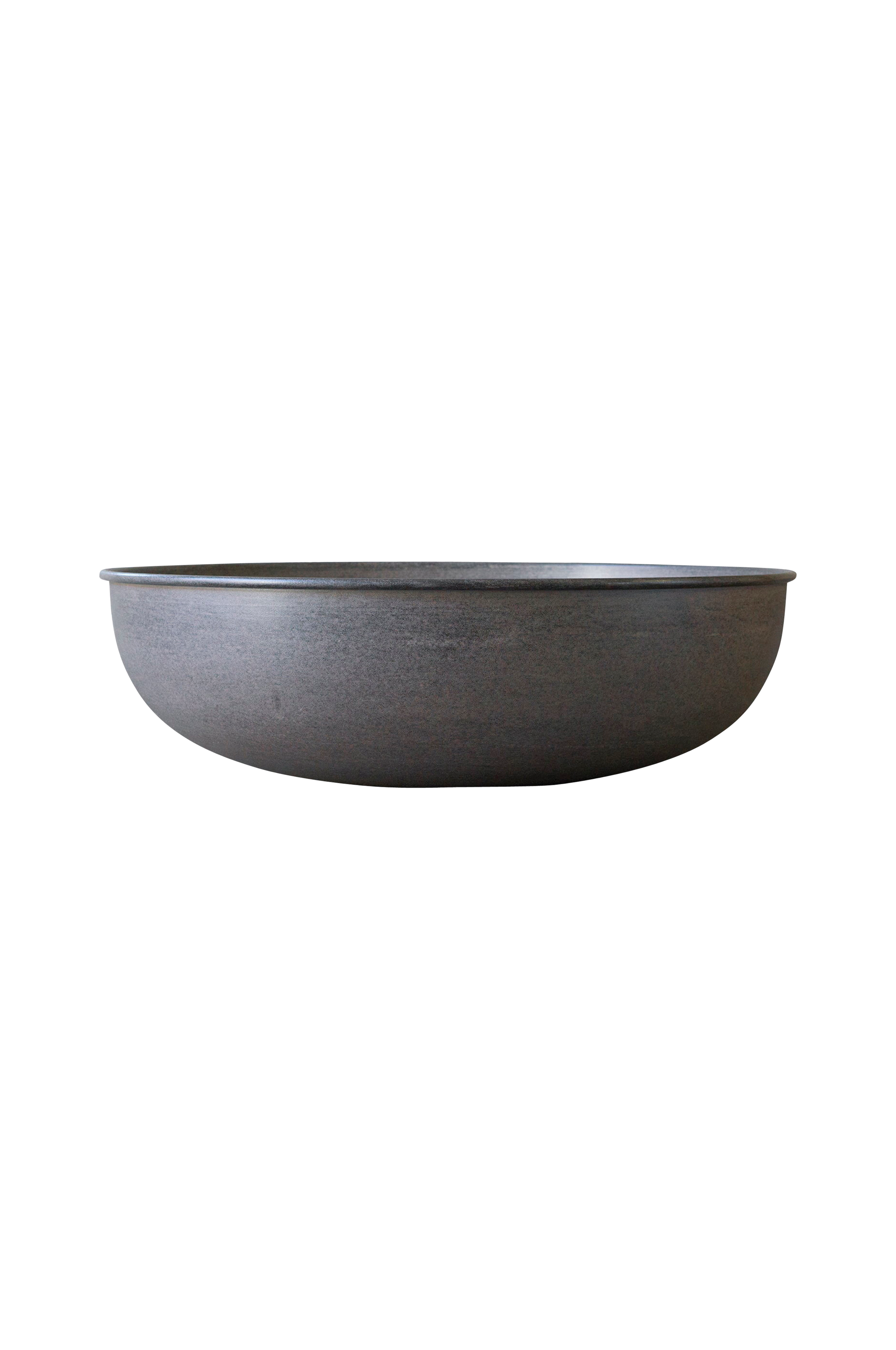 Skål Out small. Out är en elegant serie gjord av glaserad plåt, vilket innebär att den kan stå utomhus året runt. I botten finns ett dräneringshål som förhindrar att krukorna fylls med vatten. Detta hål kan också stängas med medföljande kork av plast. Diameter 30 cm och höjd 10 cm.