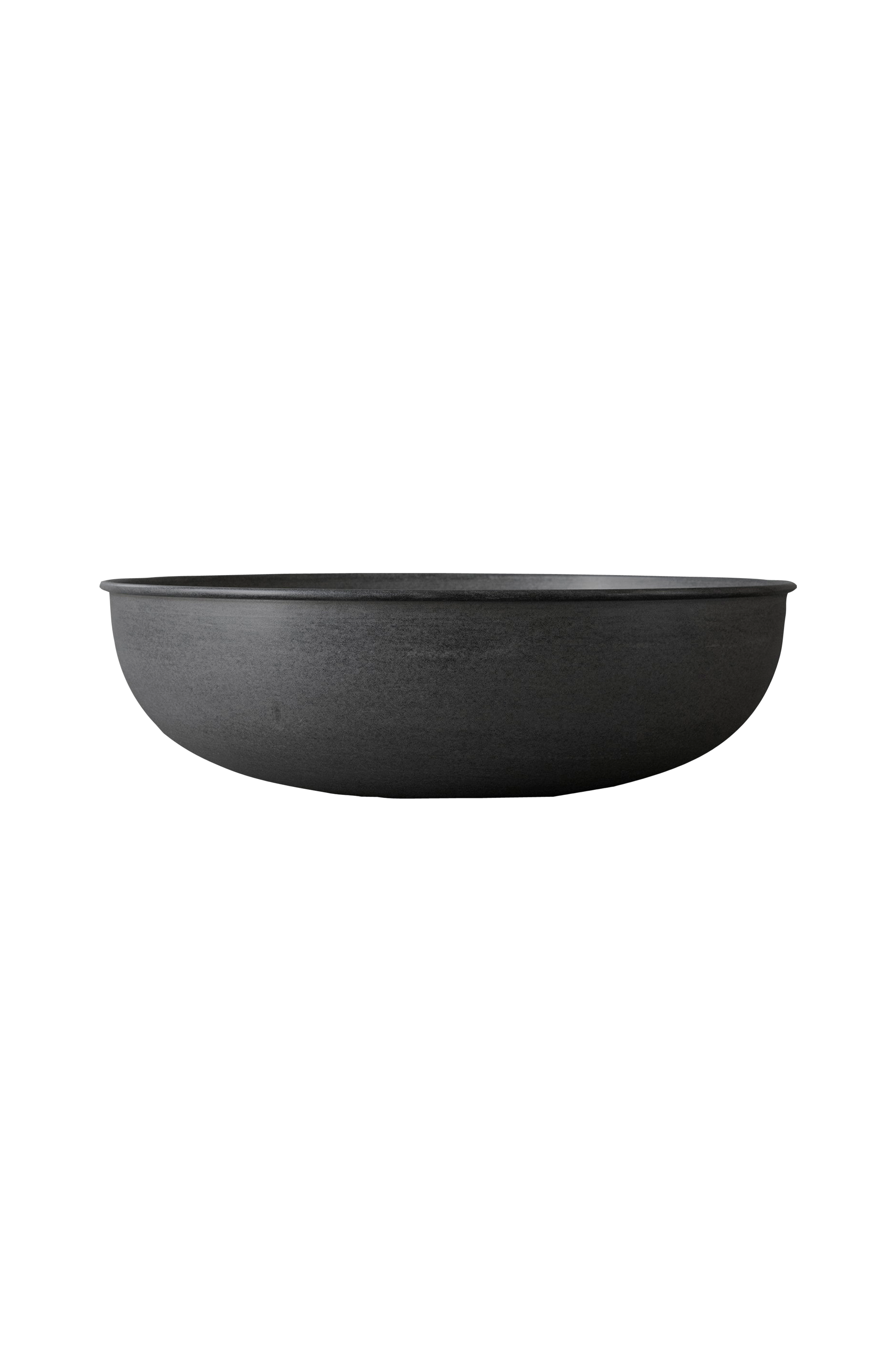 Skål Out small. Out är en elegant serie gjord av glaserad plåt, vilket innebär att den kan stå utomhus året runt. I botten finns ett dräneringshål som förhindrar att krukorna fylls med vatten. Detta hål kan också stängas med medföljande kork av plast. Diameter 30 cm och höjd 10 cm.