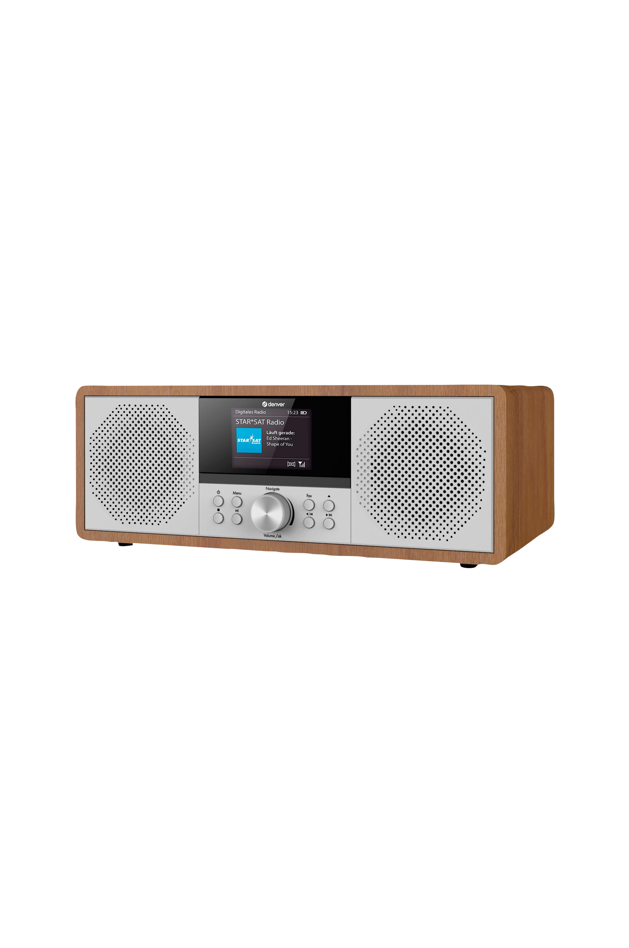 - AUX-ingång och hörlursutgång- 2,4'' färgskärm- 1-vägshögtalare- 2 x 100 W max uteffekt (2 x 10 W RMS)- Träkabinettutseende