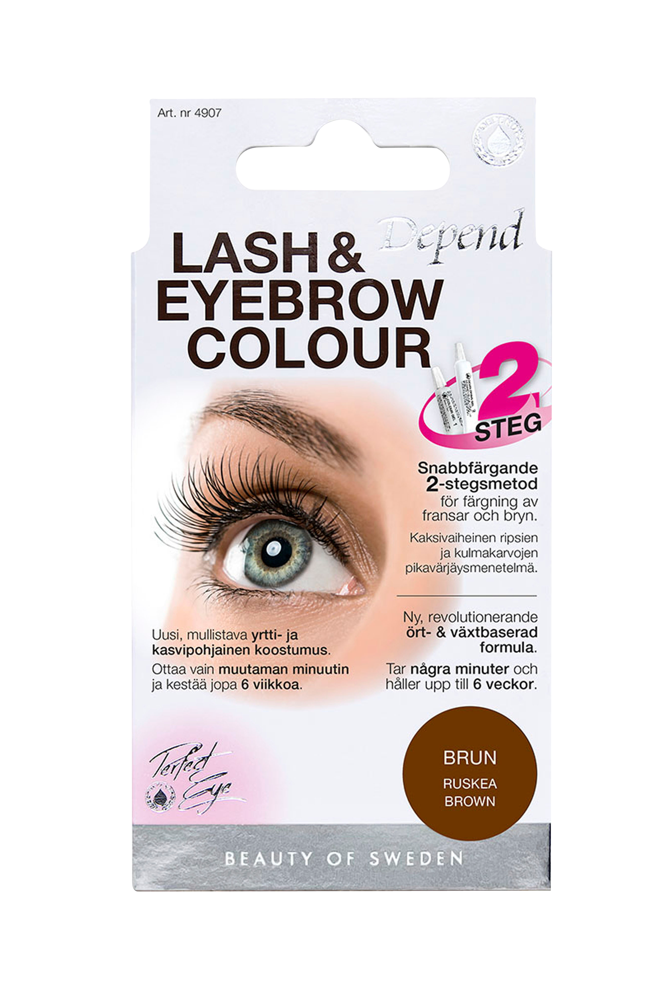 Få fräscha ögon utan makeup med Depend Lash & Eyebrow Colour. Dina ögon är alltid naturligt markerade, direkt på morgonen, när du sportar, solar eller badar. Lash & Eyebrow Colour har en ny och revolutionerande ört- och växtbaserad formula som innehåller bl.a. rölleka, ringblomma, grönt te och blåbär. Denna unika sammansättning har skapat en produkt som är vattenfast, skonsam att använda, enkel och snabb att applicera och ger en intensiv färg som vara länge. Detta ger också ett intryck av längre fransar och mer markerade bryn. Behandlingen tar bara några minuter och resultatet varar i upp till 6 veckor.