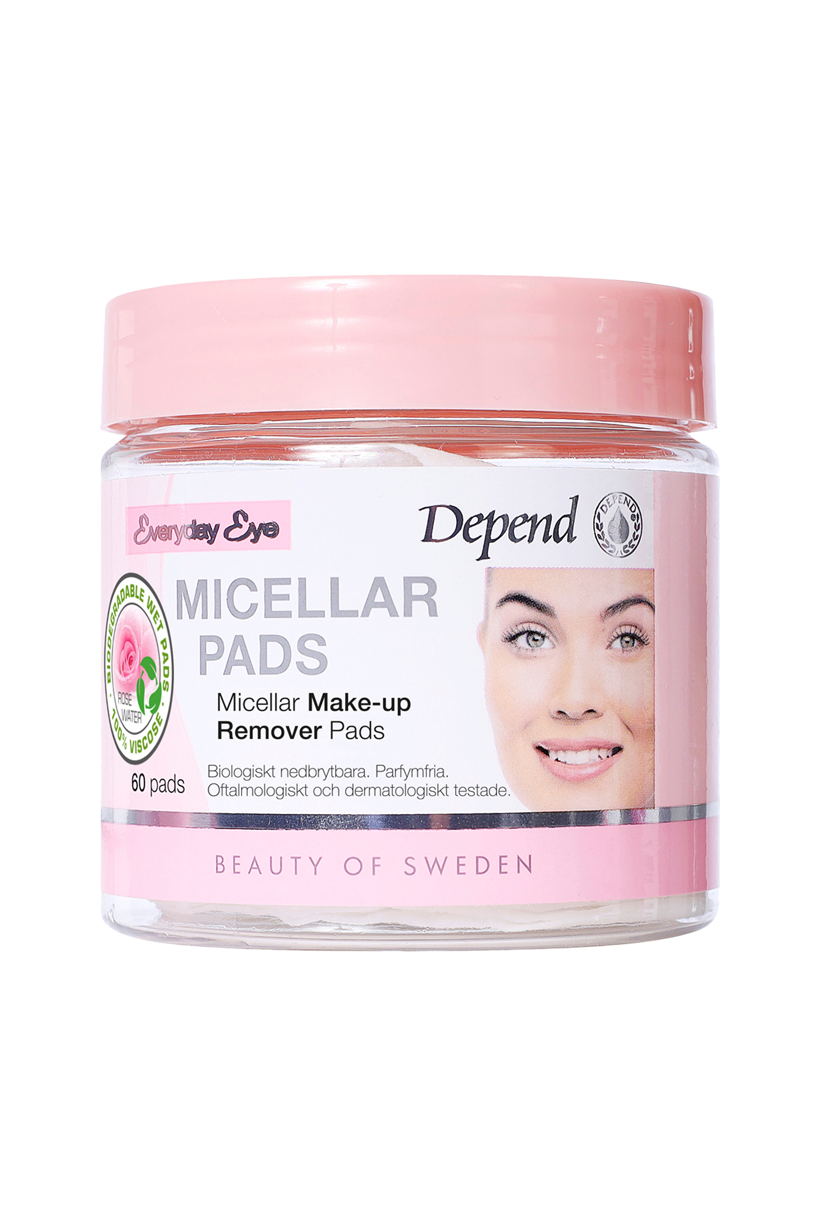 Depends Micellar Make-Up Remover Pads tar effektivt och skonsamt bort makeup och orenheter från huden och det extra känsliga området kring ögonen. Padsen är fyllda med micellärvatten som fångar upp orenheter, återfuktar och ger huden en fräsch känsla. Berikad med E-vitamin. Parfymfri, oftalmologiskt och dermatologiskt testad. Stryk försiktigt padsen över stängt öga för att avlägsna all makeup.