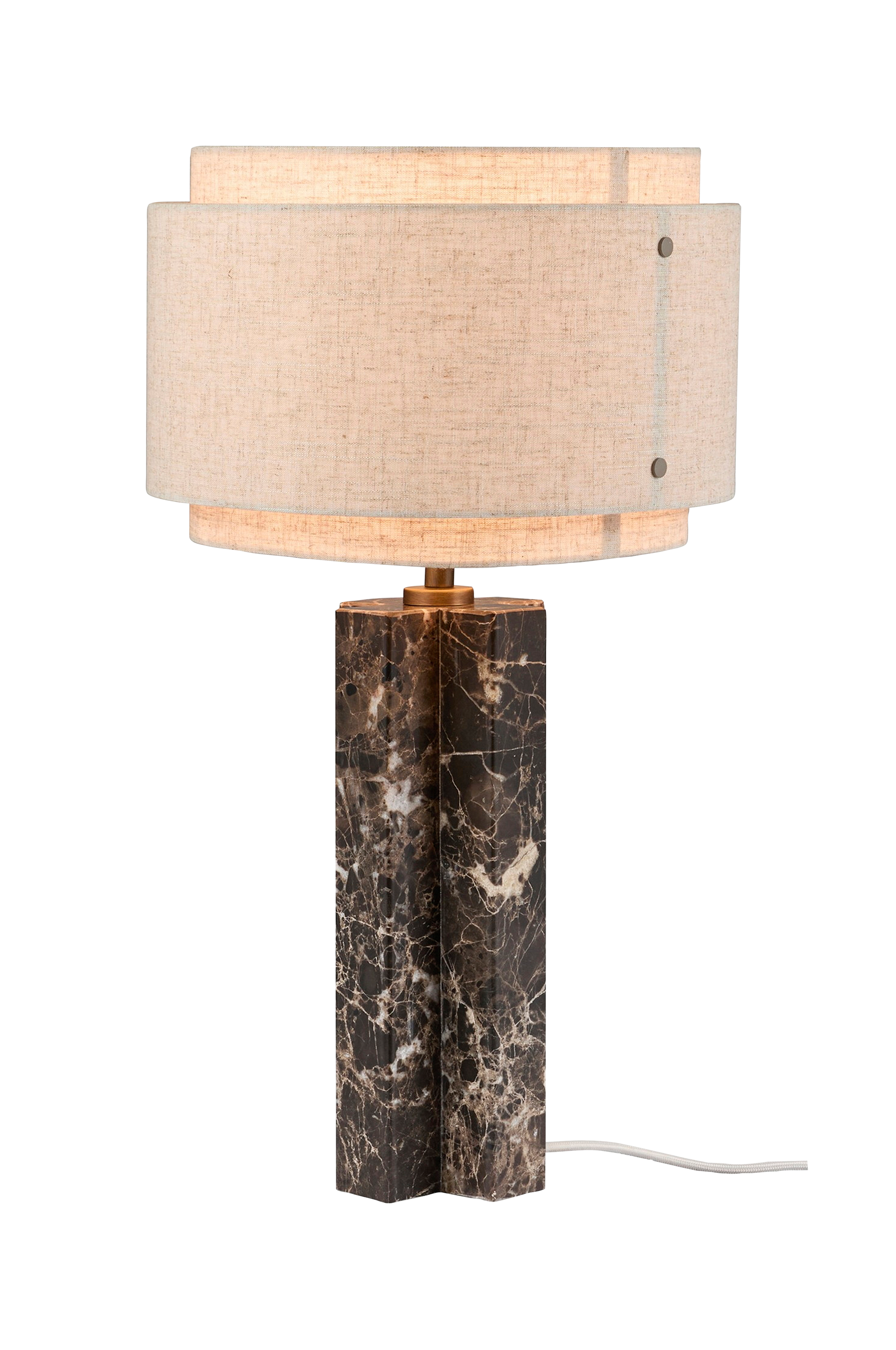 Den ikoniska takai bordslampan från studio mavro//lefèvre av sofie lefèvre är inspirerad av arkitektonisk brutalism, som fokuserar på material, texturer och taktilitet. Den solida, bruna marmorbasen har en spännande form som utan ansträngning bär upp den ljusa tygskärmen. Takai är en vacker statementmöbel som inbjuder till att titta på den från många olika vinklar. Kombinationen av brun marmor, linne och brännförgylld mässing skapar ett mycket mjukt och varmt formspråk.
